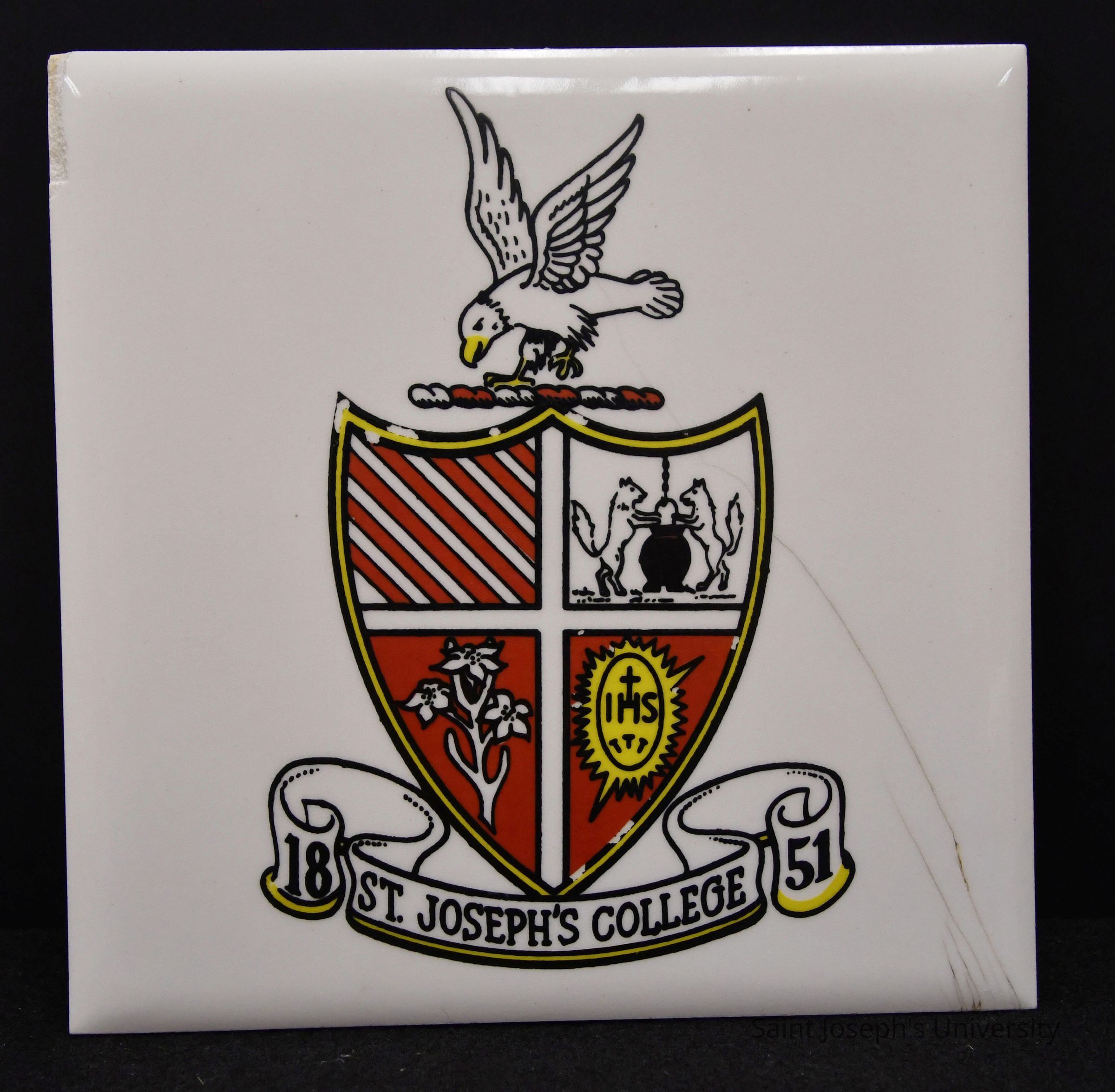 White ceramic tile with cork backing. The Saint Joseph's College shield is painted in yellow, red, and black on the tile with the Hawk mascot at the top and a banner below noting "St. Joseph's College 1851."