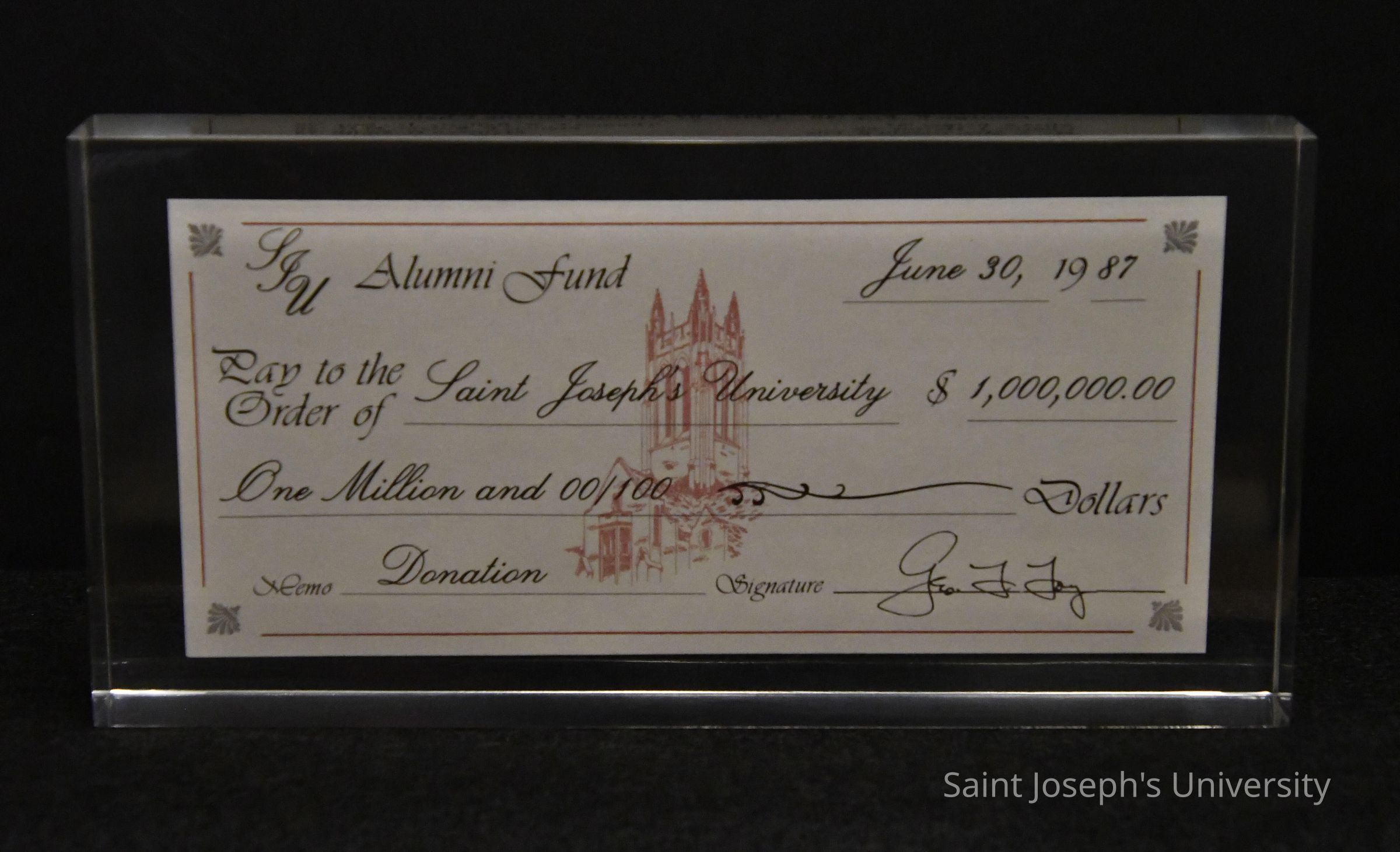 Rectangle-shaped resin paperweight which encloses a check to Saint Joseph's University from the Alumni Fund for one million dollars on June 30, 1987, signed by George F. Foy (class of 1949). On the back are listed the members of the Alumni Fund with George F. Foy, Michael J. Smith, S.J., and Nicholas S. Rashford, S.J.