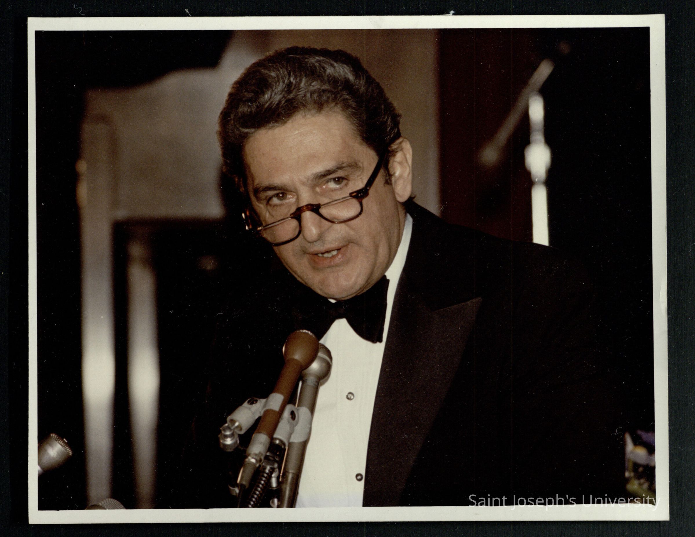 Deframed 8x10 color photograph of Hon. Thomas M. Foglietta speaking at a podium. Box 8 Item 125.