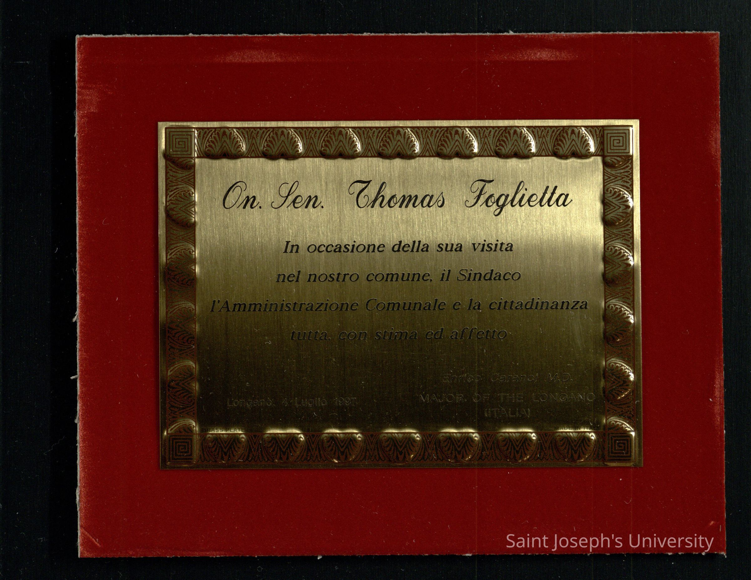 Deframed brass colored resin award or plaque bordered by red velvet and backed by cardboard. The plaque notes "On Sen. Thomas Foglietta/ In occasione della sua visita/ nel nostro comune. il Sindaco/ ;'Amministrazione Comunale e la cittadinanza/ tutta, con stima ed affetto/ Enrico Caranci M.D./ Majjor of the Longano/ Italia/ Longano, 4 Luglio 1997."