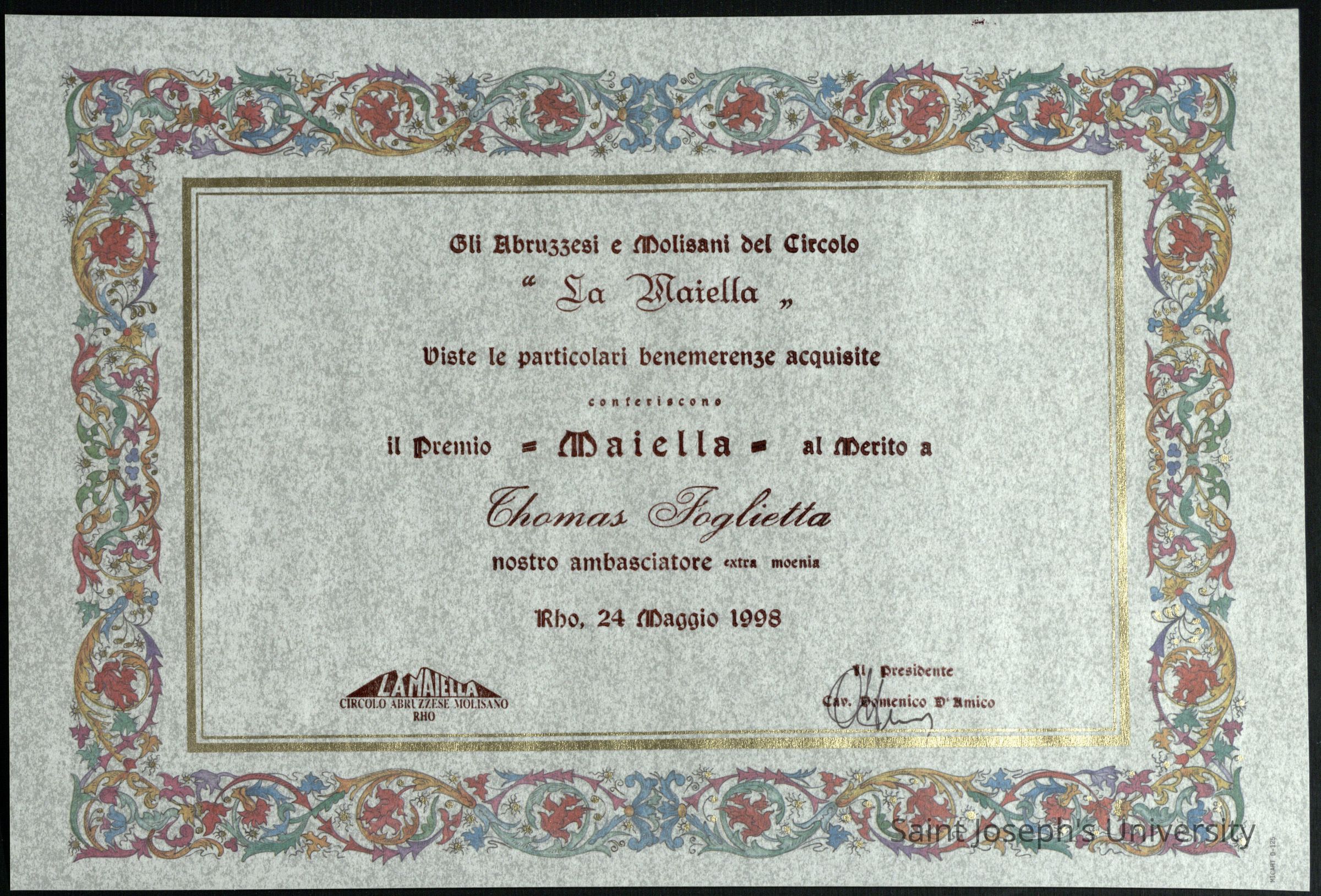 Deframed award or certificate with a highly stylized and colored floral border. Text includes "Gli Abruzzesi e Molisani del Circolo/ 'La Maiella'/ Viste le particolari benemerenze acquisite/ conferiscono/ il Premio = Maiella = al Merito a/ Thomas Foglietta/ nostro ambasciatore extra moenia/ Rho, 24 Maggio 1998" and signed il Presidente Ca. Domenico D'Amico.