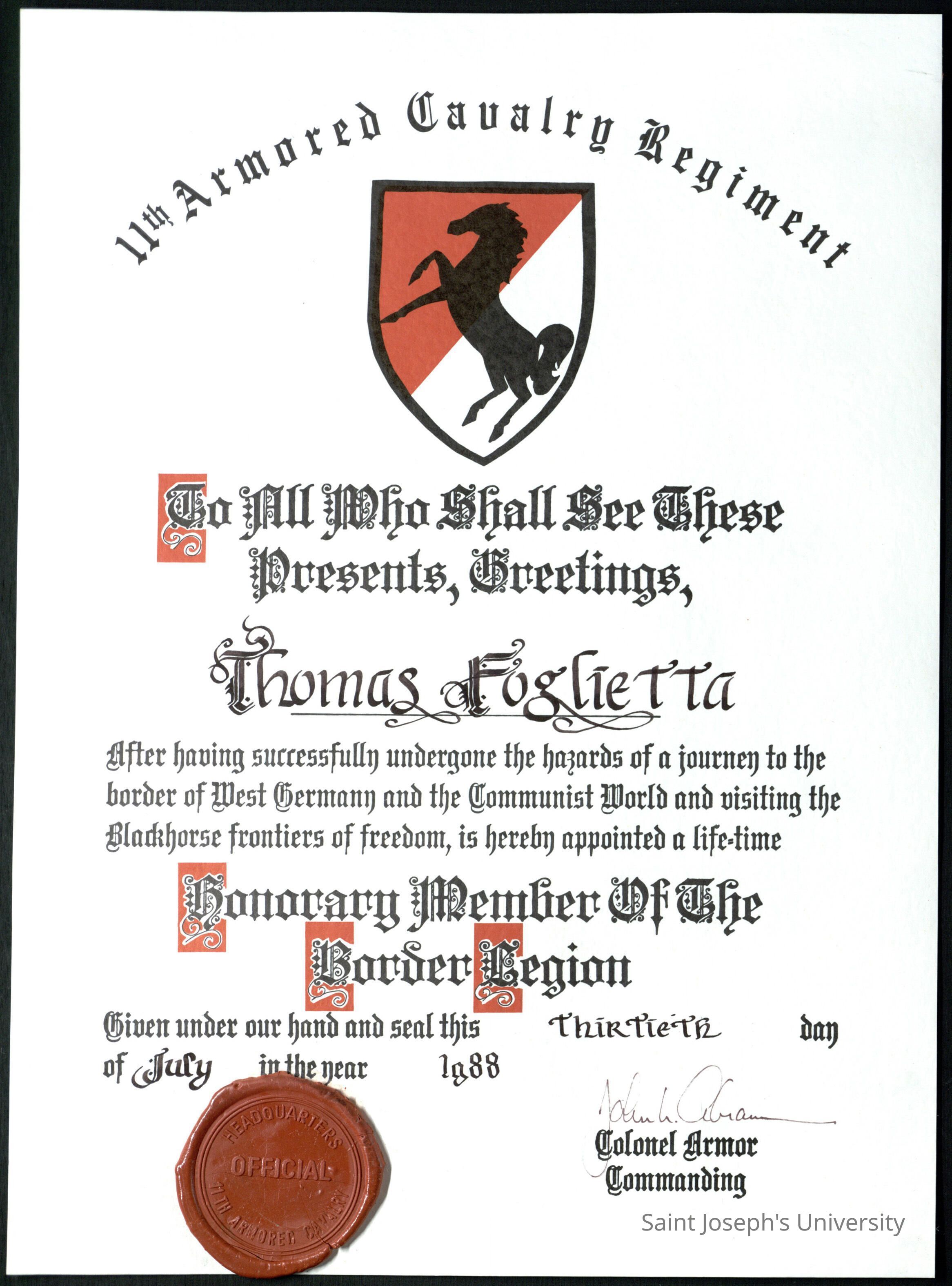 Deframed certificate with wax seal. Certificate includes "11th Armored Cavalry Regiment/ To All Who Shall See These/ Presents, Greetings,/ Thomas Foglietta/ After having successfully undergone the hazards of a journey to the/ border of West Germany and the Communist World and visiting the/ Blackhorse frontiers of freedom, is hereby appointed a life-time/ Honorary Member of The/ Border Region/ Given under our hand and sent this thirteenth day/ of July in the year 1988" signed by John Abram, Commanding Colonel Armor.