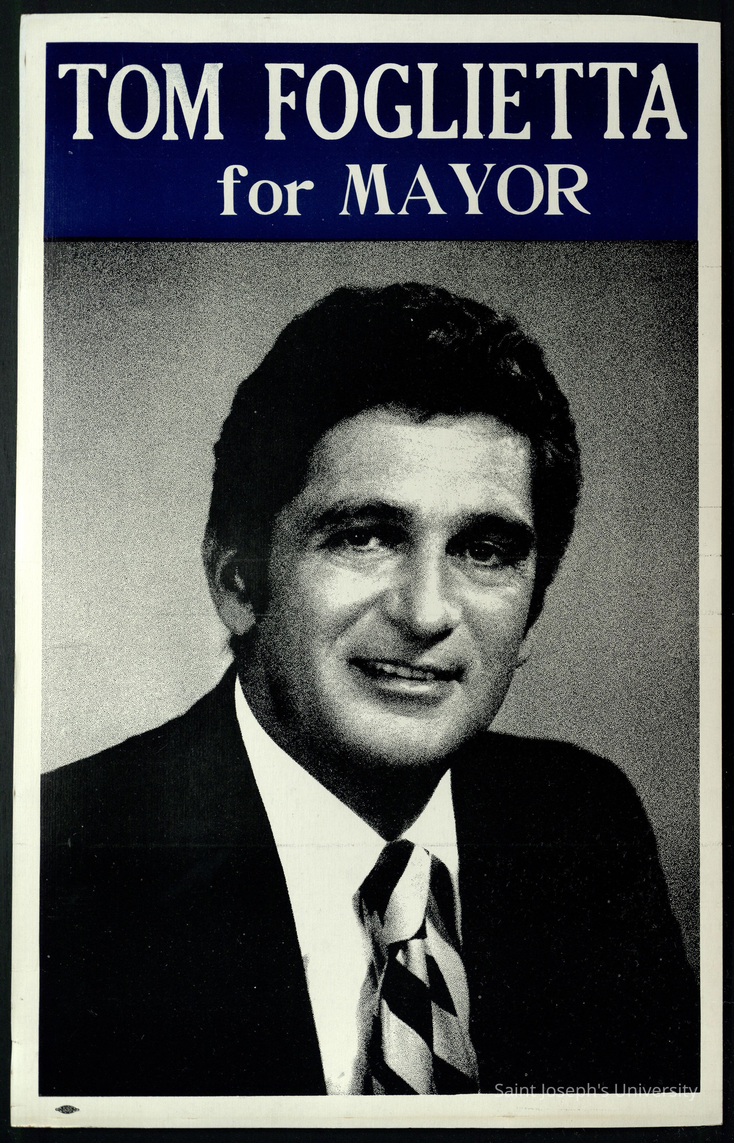 Political poster on paperboard with black and white image of Thomas Foglietta and "Tom Foglietta/ for Mayor" from 1975. Box #9 Item #136