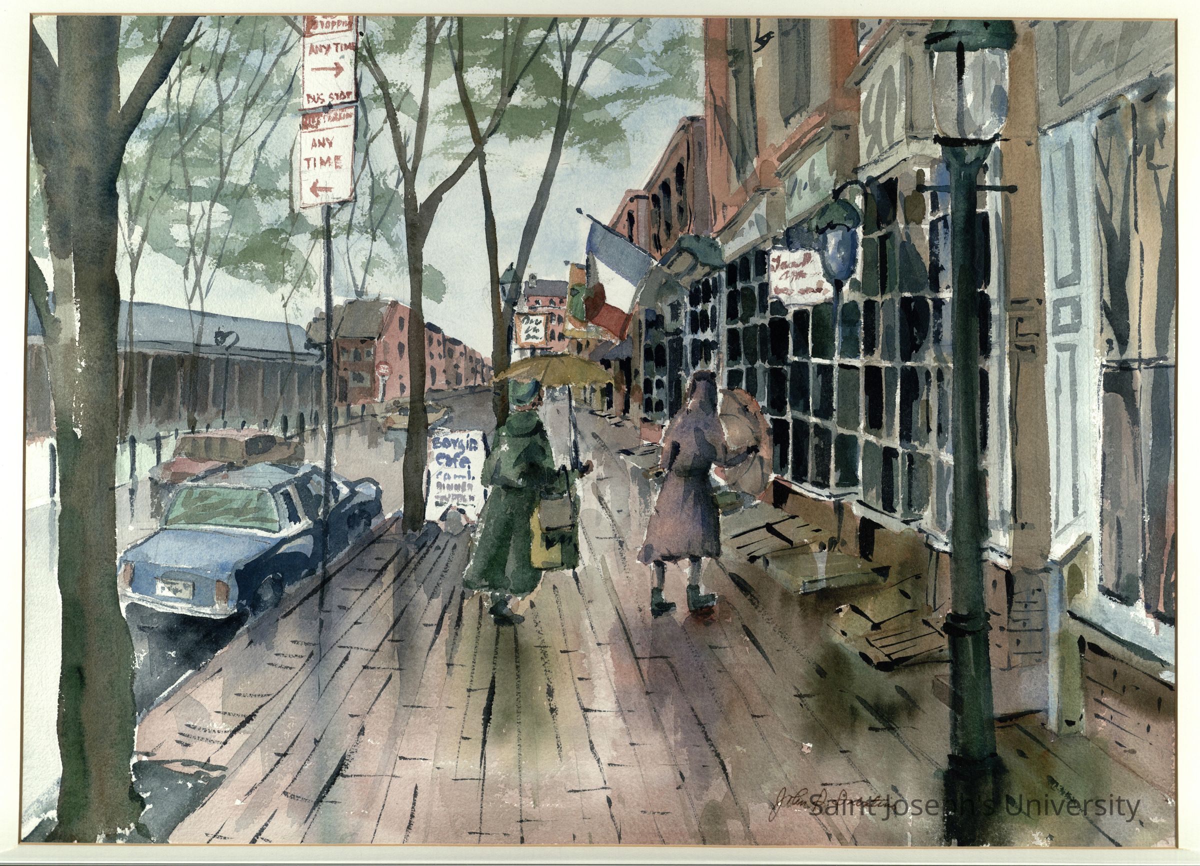 Watercolor painting titled "Rainy Day Head House Square" by John S. Sabatino for Thomas M. Foglietta. Oversize Frame 270.