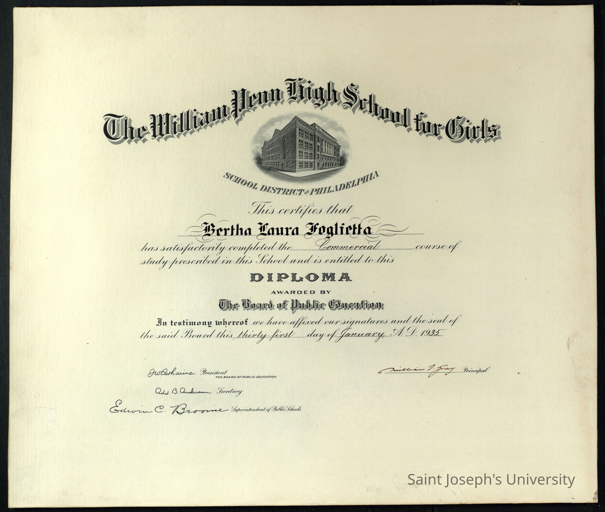 Diiploma on paper board from The William Penn High School for Girls given to Bertha Laura Foglietta on January 31, 1935. It has lost its TF Collection accession number.