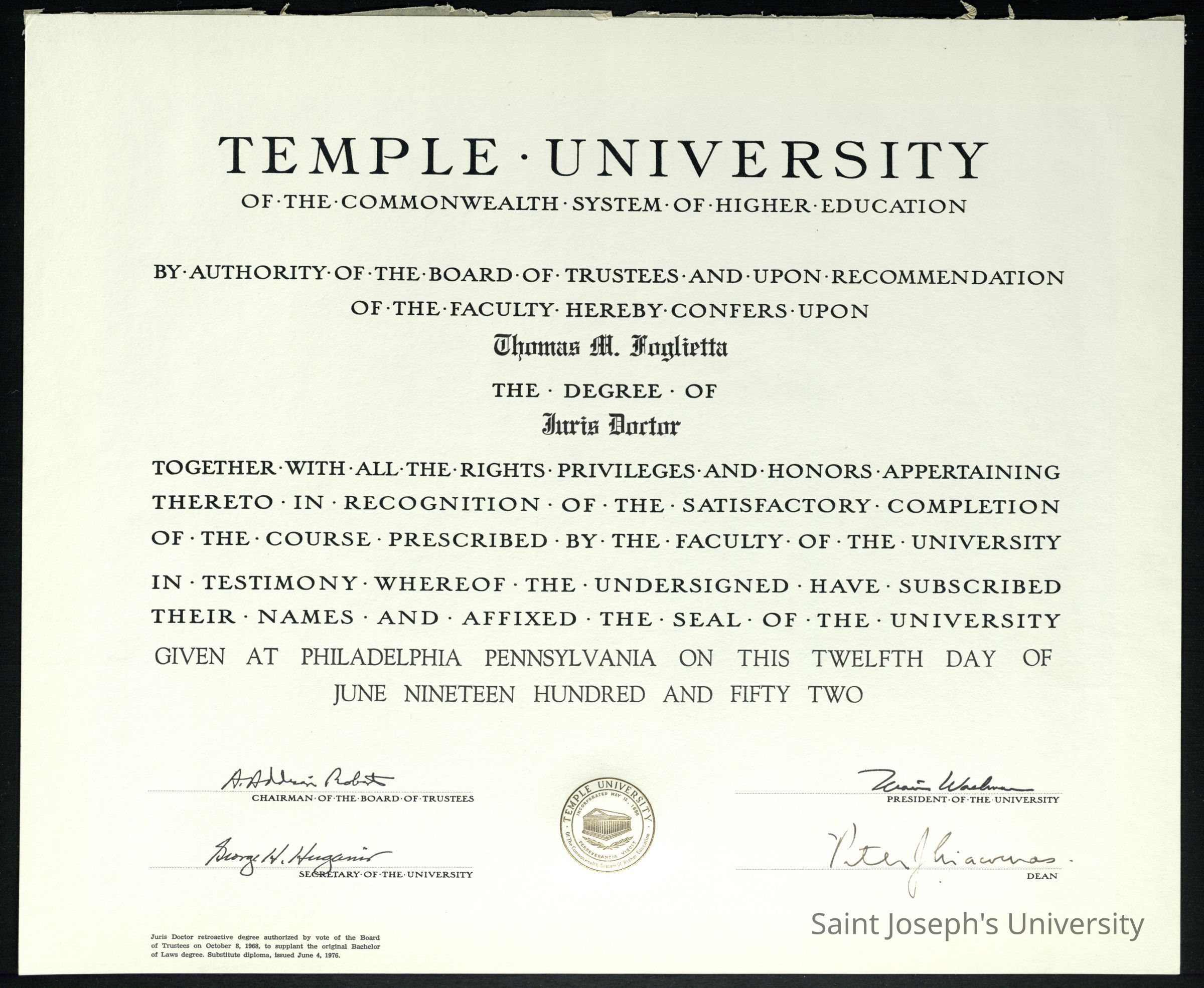 Diploma from Temple University bestowed upon Thomas M. Foglietta the degree of Juris Doctor on June 12, 1952.
