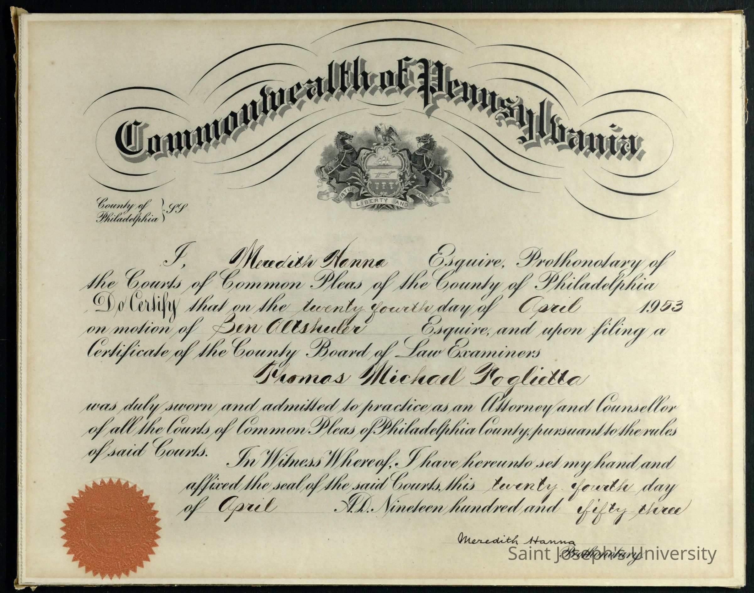 Decoration of Honor or certificate noting the swearing in of Thomas Michael Foglietta as an attorney and counselor of Pennsylvania by Meredith Hanna and Ben Altschuler, April 24, 1953.