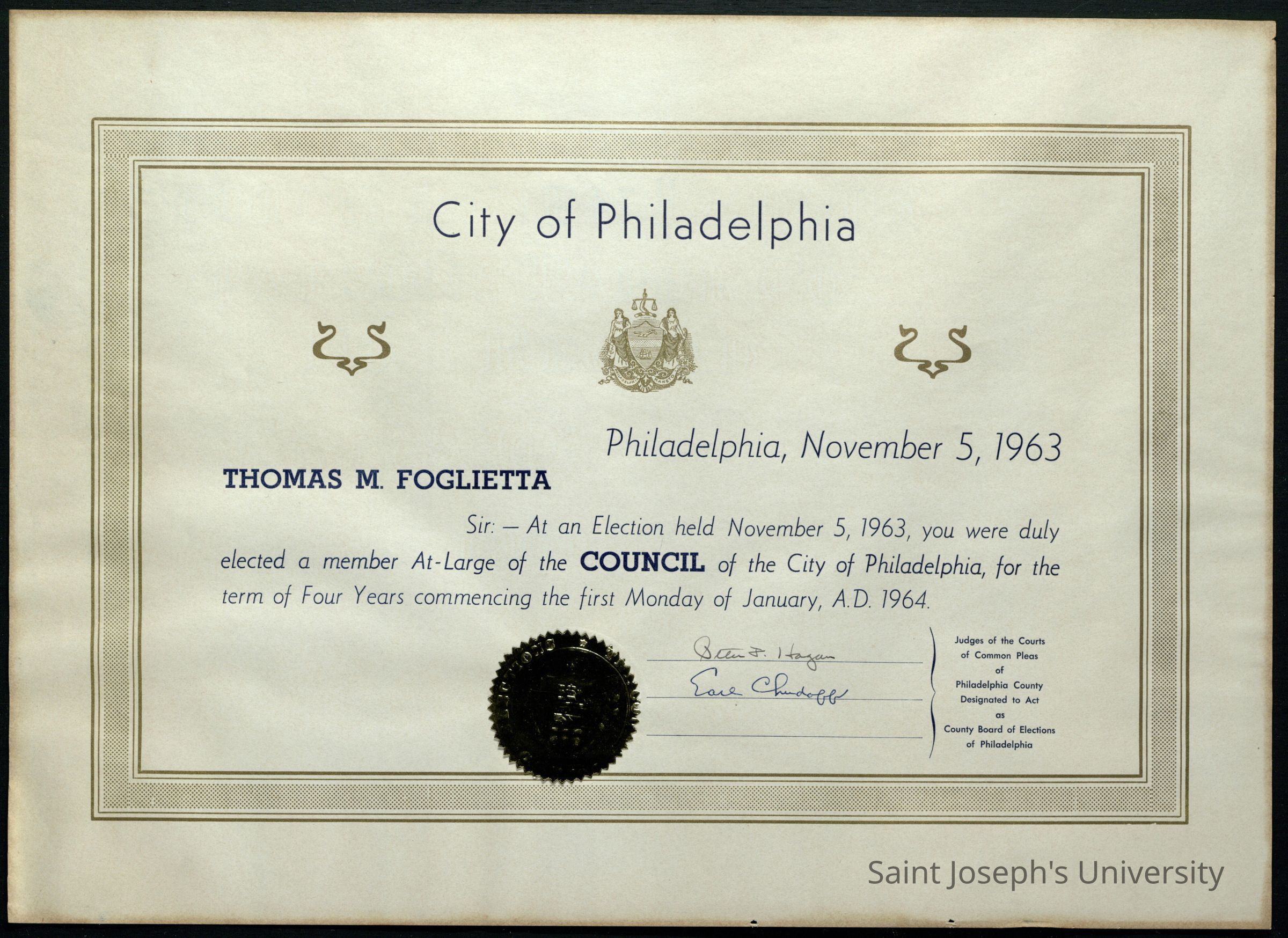 Two copies of a certificate commemorating Thomas M. Foglietta's election to the City Council of Philadelphia for the January 1964-1968 term. Box 7 Item 92B.