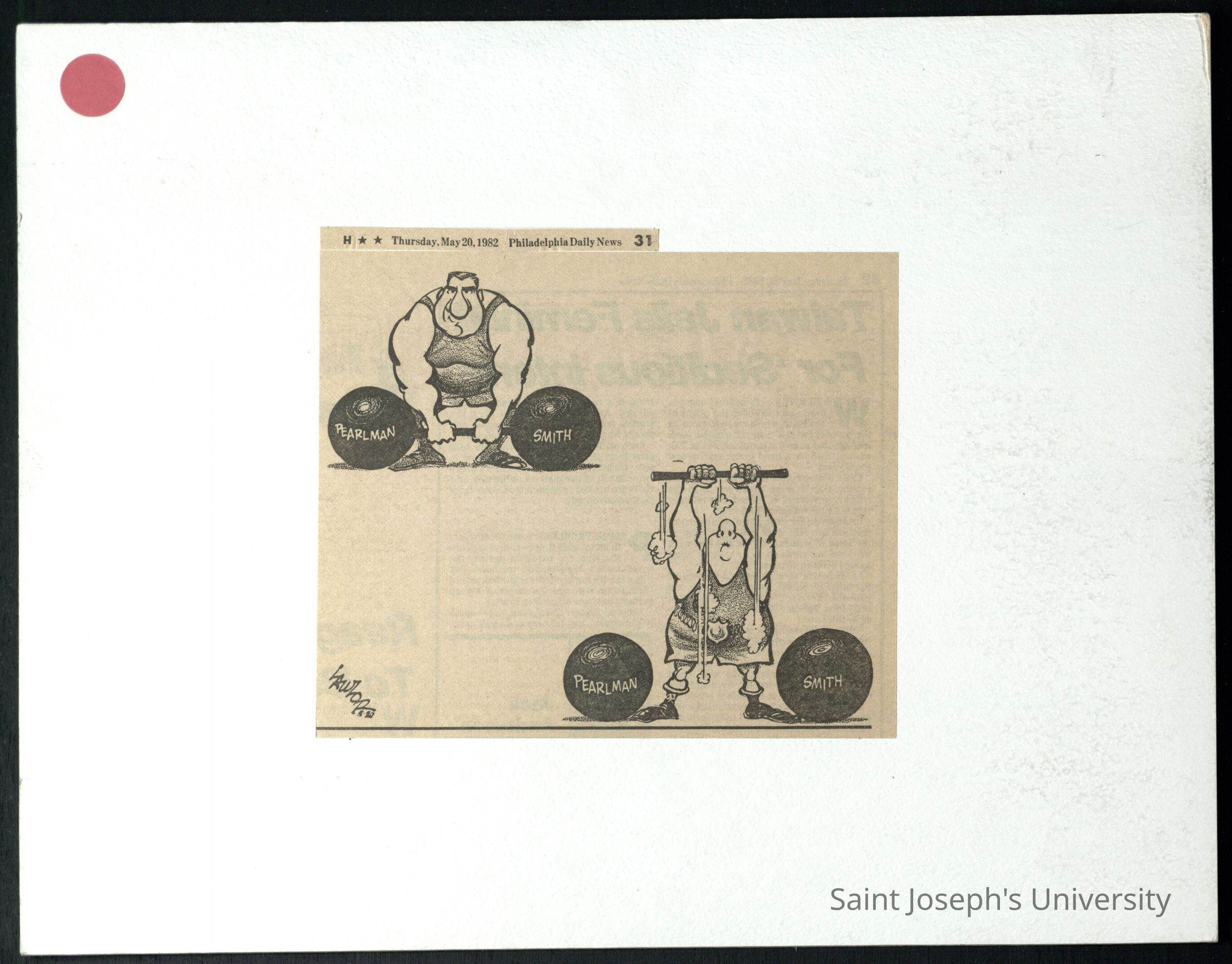 Copy of an ink political cartoon referencing Pearlman and Smith and a broken barbell published in the Philadelphia Daily News on May 20, 1982, page H31. Signed by Rob Lawlor.