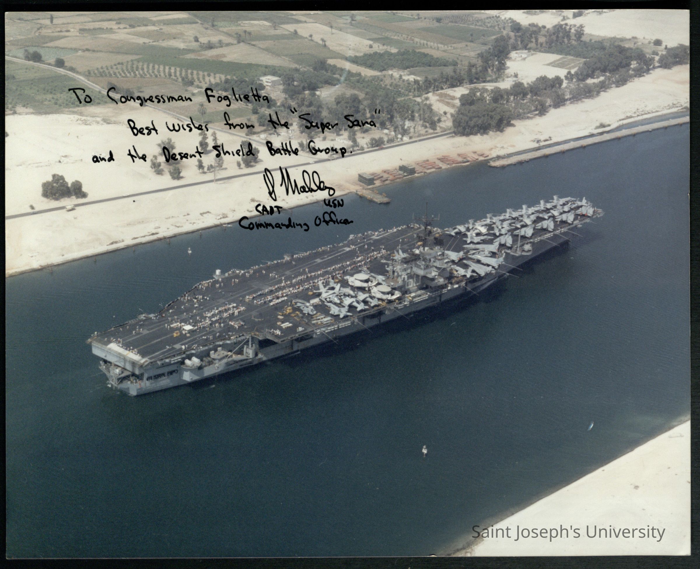 Color photograph of the USS Saratoga (CV-60) in the Suez Canal in the air on September 24, 1990 by PHAN Glen Sircy of the U.S. Navy. The photograph is signed "To Congressman Foglietta/ Best Wishes from the 'Super Sara' and the Desert Shield Battle Group./ Capt. S. Mahley (sp), USN, Commanding Officer."