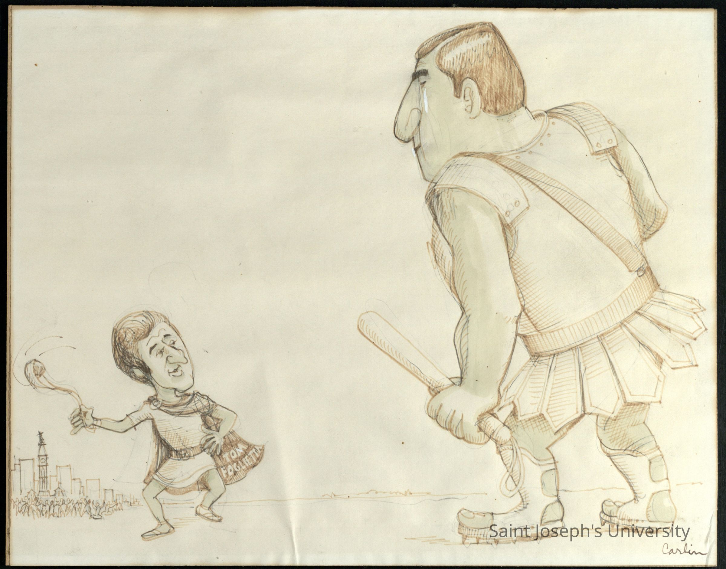 Cartoon by artist Carlin depicting Thomas M. Foglietta as David fighting Goliath. Box 9 Item 131.