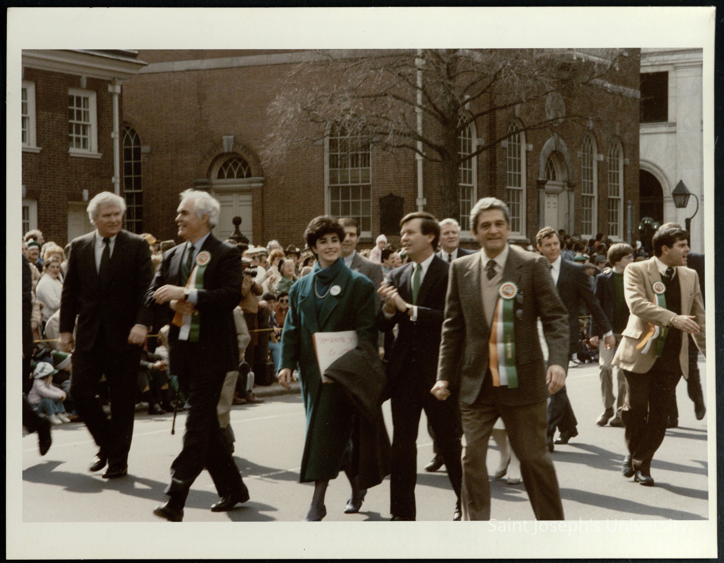 Large color photograph of Thomas M. Foglietta walking in a parade crowd in front of Independence Hall on St. Patrick's Day. Box 15 Item 200.