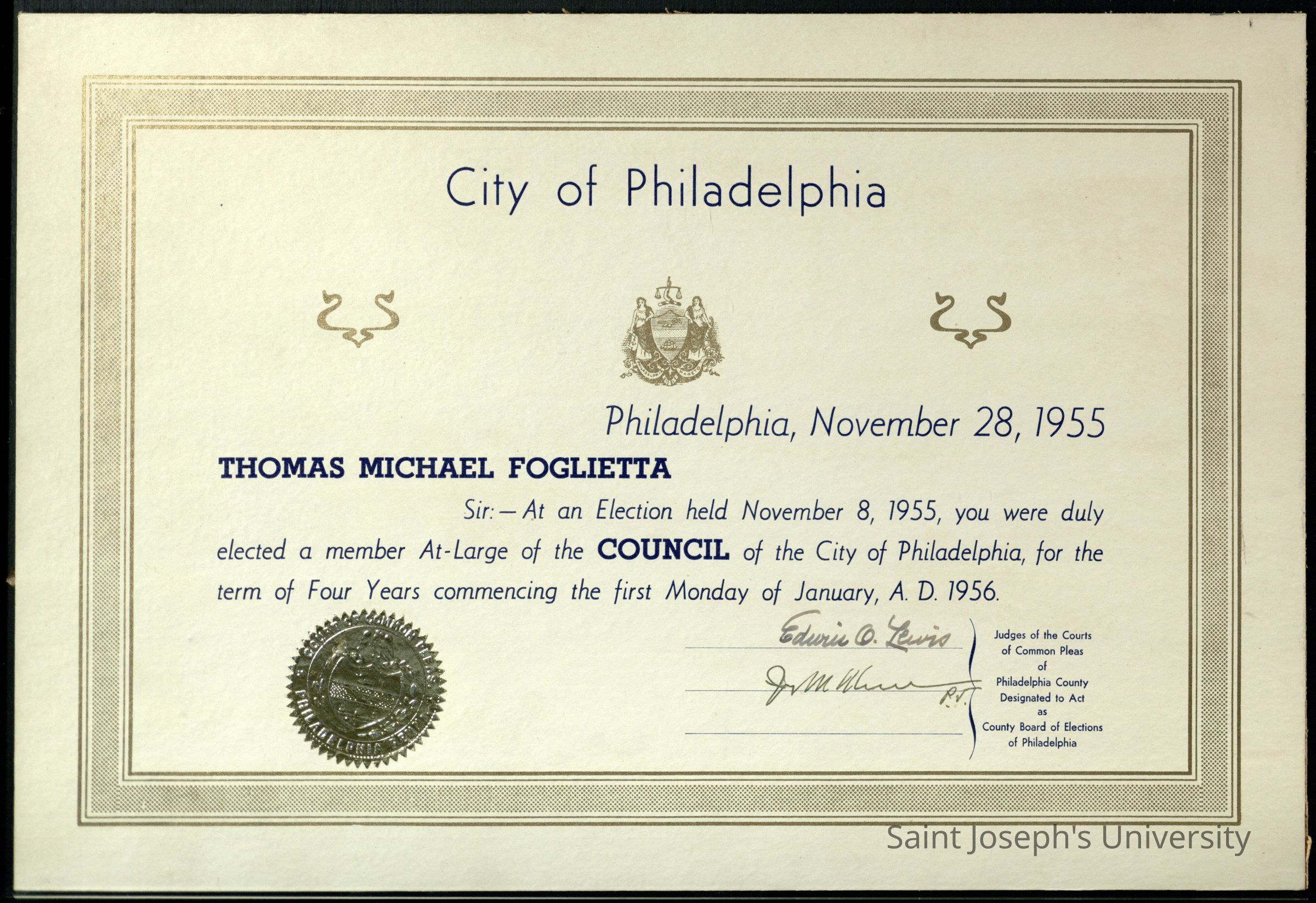 Commemorative certificate notifying Thomas M. Foglietta of his election to the City Council of Philadelphia on November 8, 1955 for the January 1956-1960 term. Attached to paperboard.