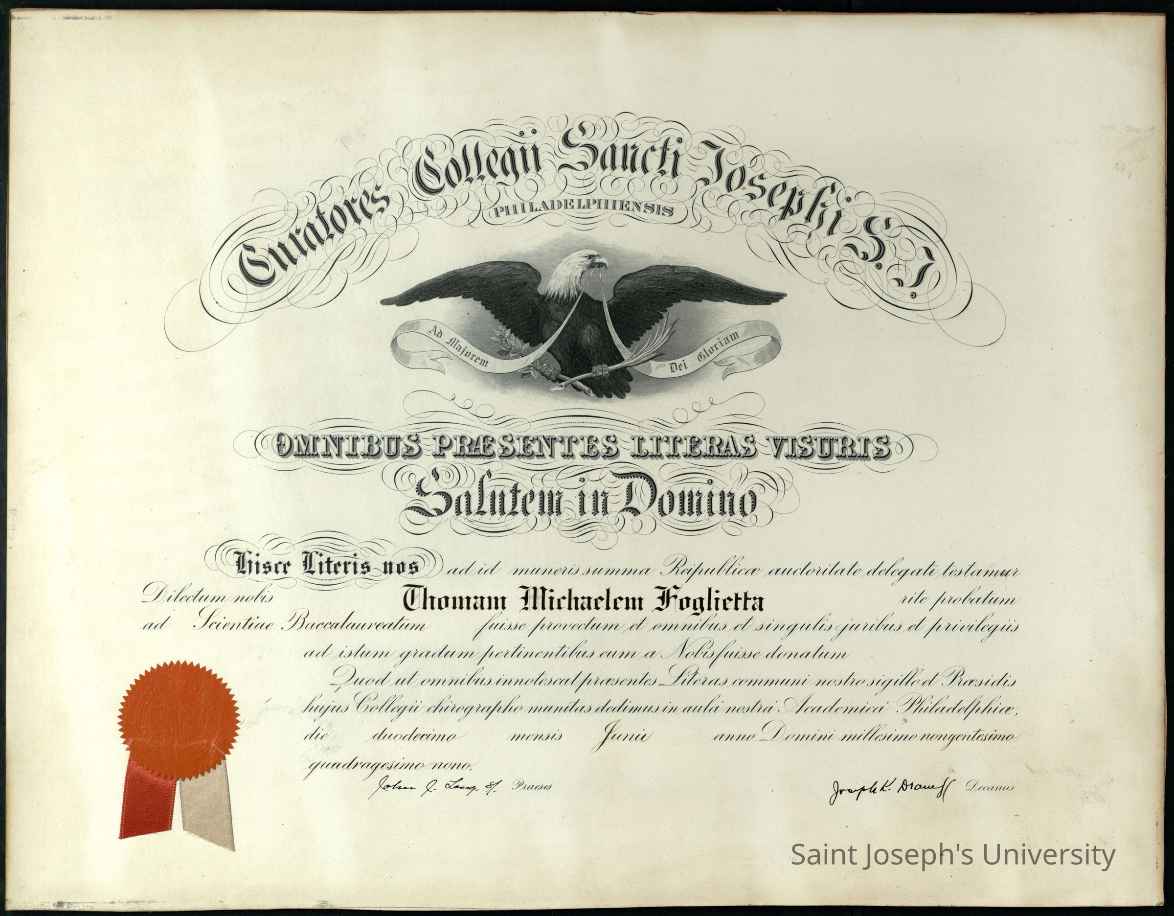 Diploma given to Thomas M. Foglietta upon his graduation from Saint Joseph's College in 1949. He received a Bachelor of Science. Attached to paperboard.