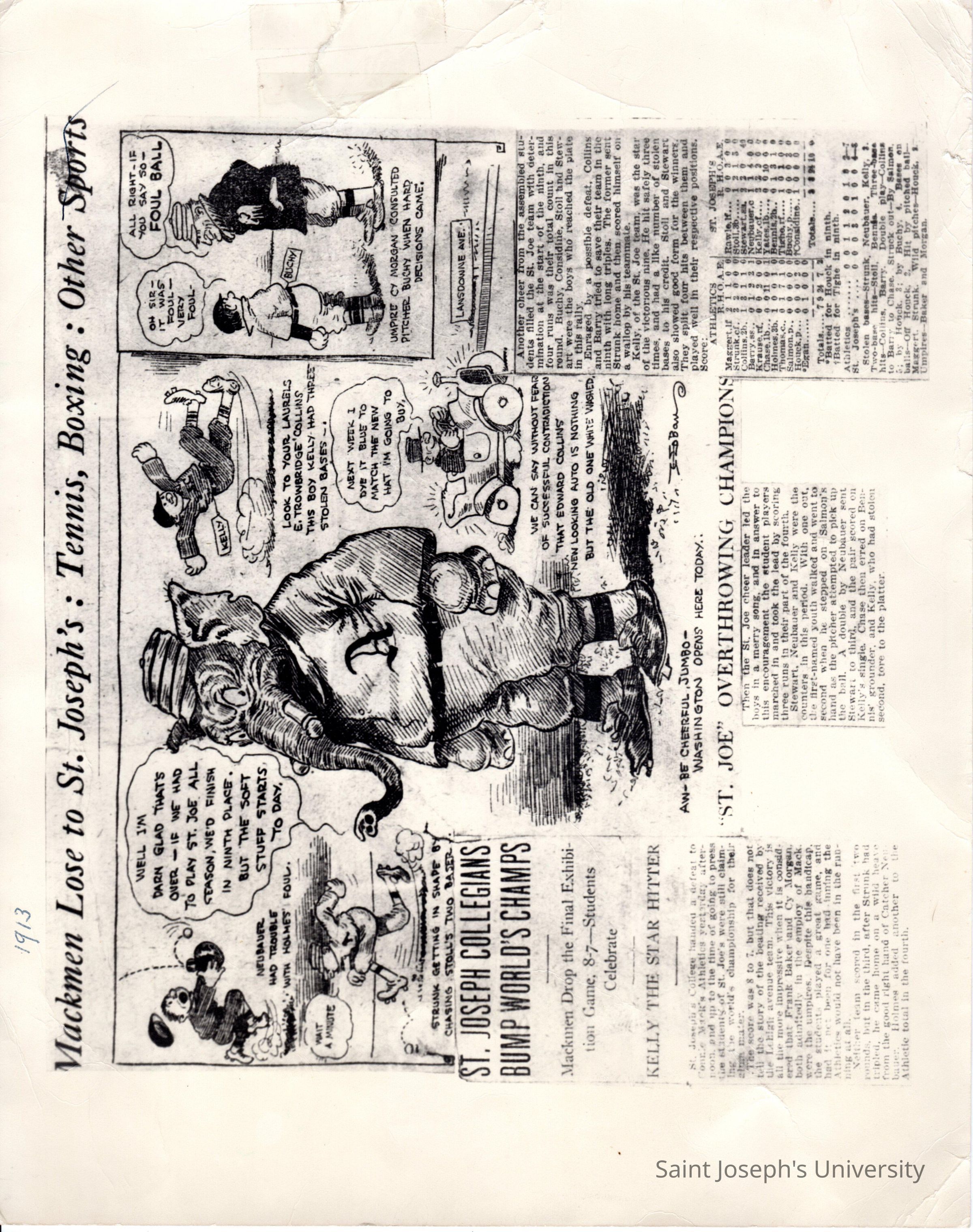 Copy of a newspaper cartoon and news articles on thick paper. The copy includes cartoons and articles about the Saint Joseph's win in a baseball championship in 1913.