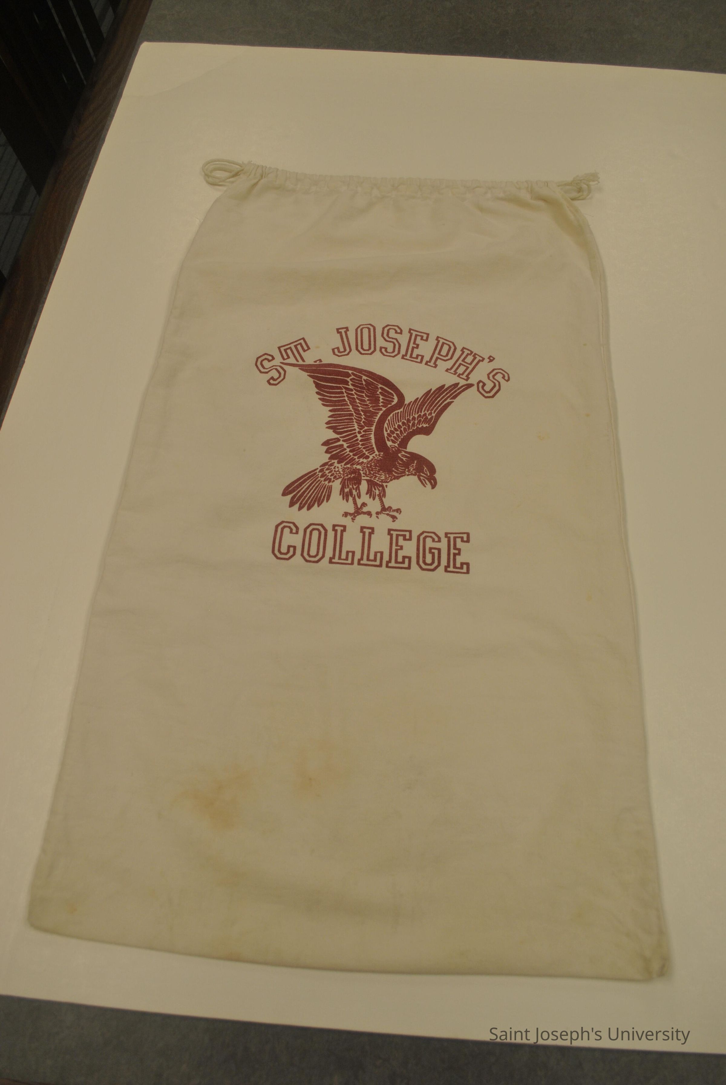 White cotton laundry bag with "SAINT JOSEPH'S COLLEGE" and an image of the hawk mascot in crimson. The bag most likely dates to the 1970s due to the likeness of the hawk, use of SJC and Fr. Lombardi's arrival to campus in 1970.