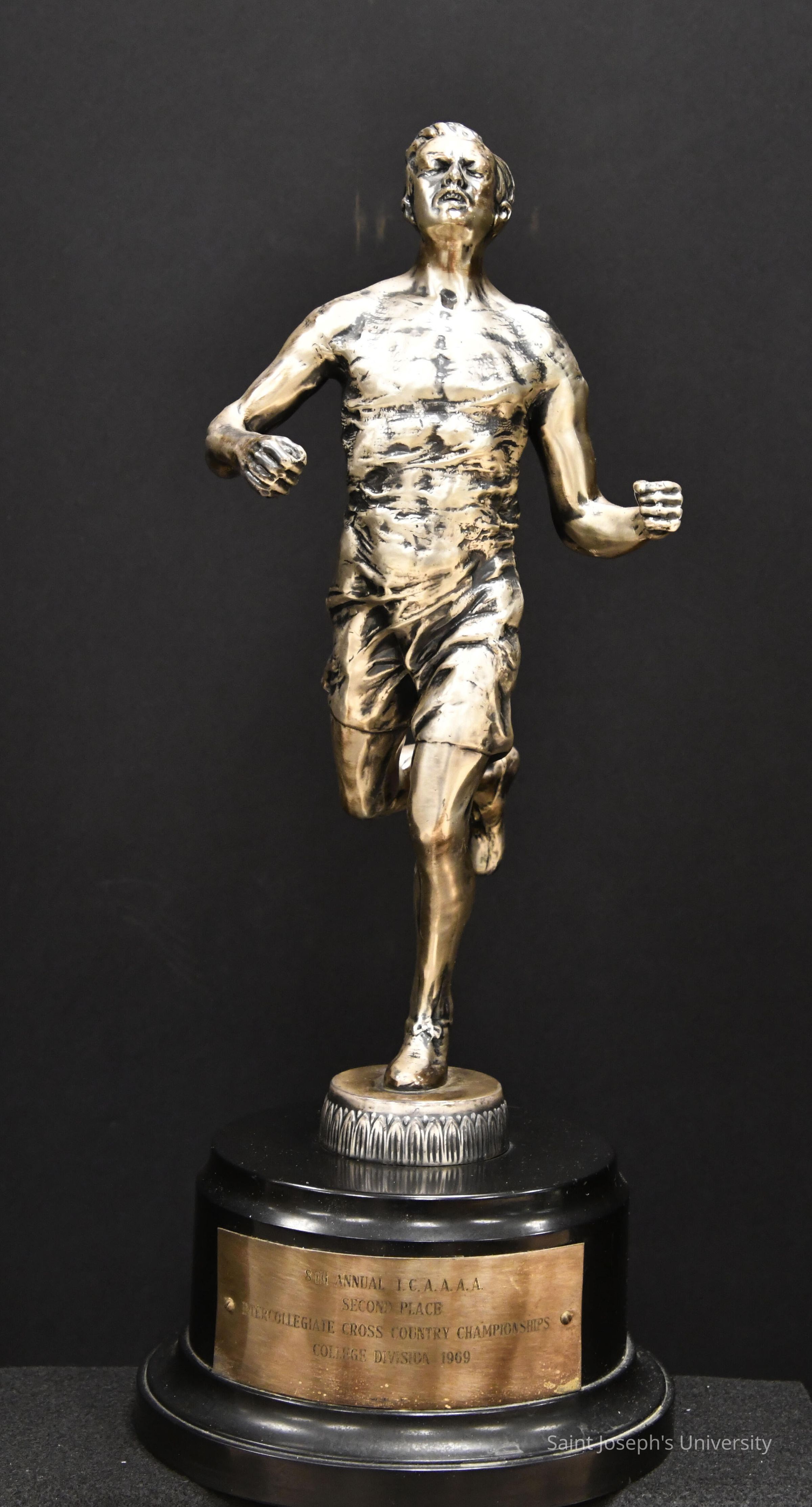 Muscular male crosscountry runner on a pedistal with black base and inscribe plaque.Made/Created