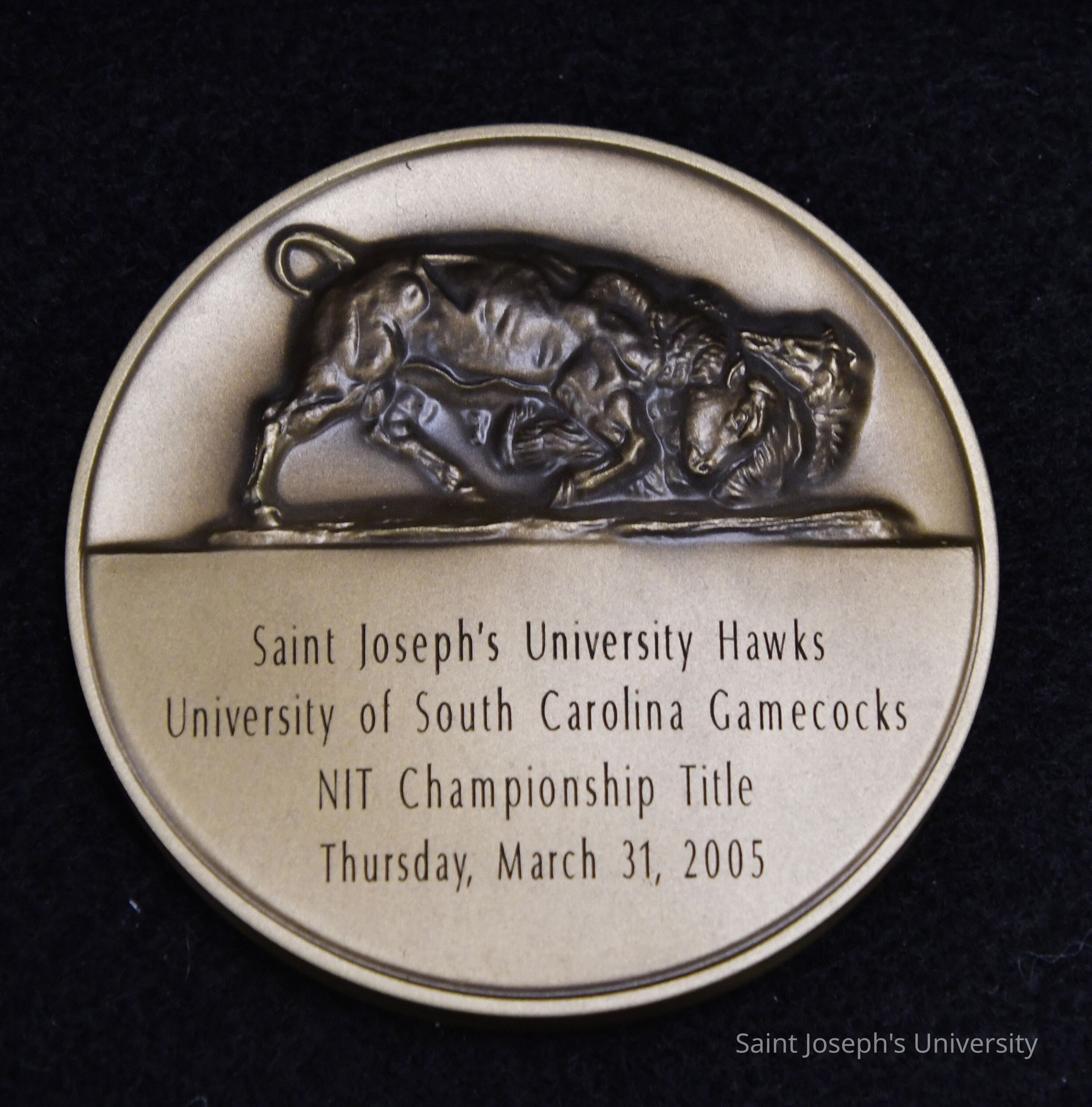 Round commemorative medal (plaque) celebrating the NIT (National Invitational Tounament) basketball championship game played between the Saint Joseph's University Hawks and the University of South Carolina Gamecocks played on Thursday, March 11, 2005. Face contains a 3D image of a bull. The reverse has a building image and is inscribed "New York Stock Exchange 1792."