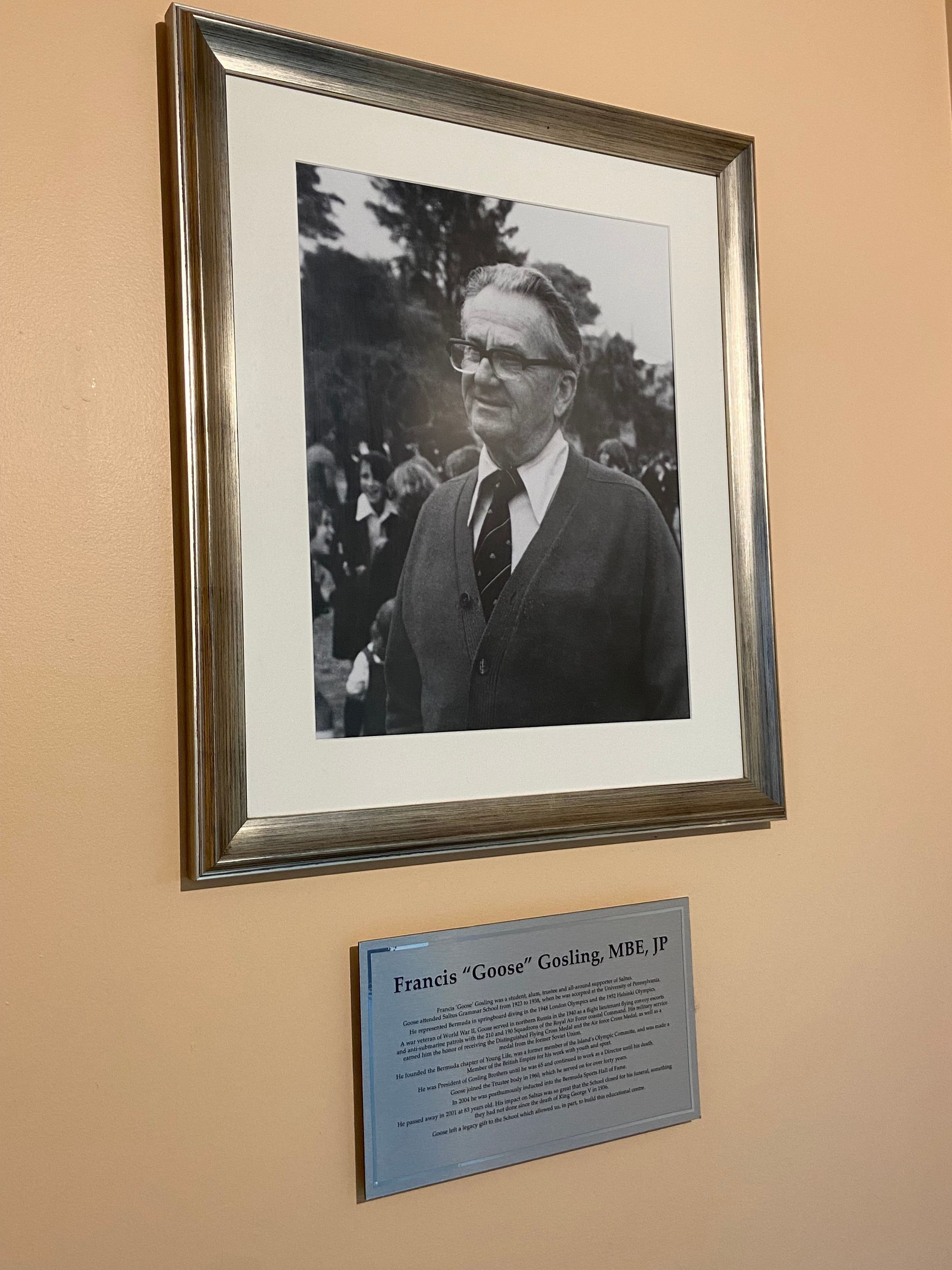 Portrait and Accompanying Plaque Memorising Francis 'Goose' Gosling'. Mounted on wall on Level 3 of Gosling Building (next to Music Room).Created By