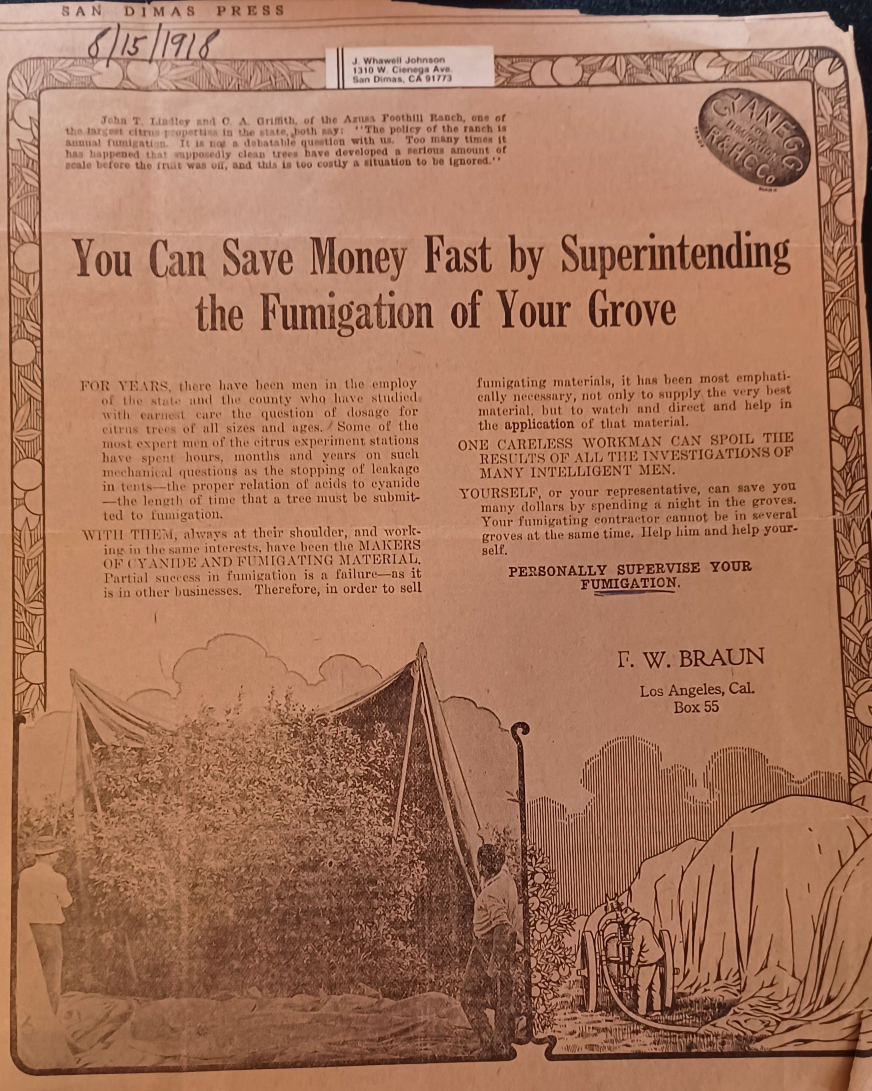 Newspaper article - San Dimas Press, "You Can Save Money Fast by Superintending the Fumigation of Your Grove," dated August 15, 1918