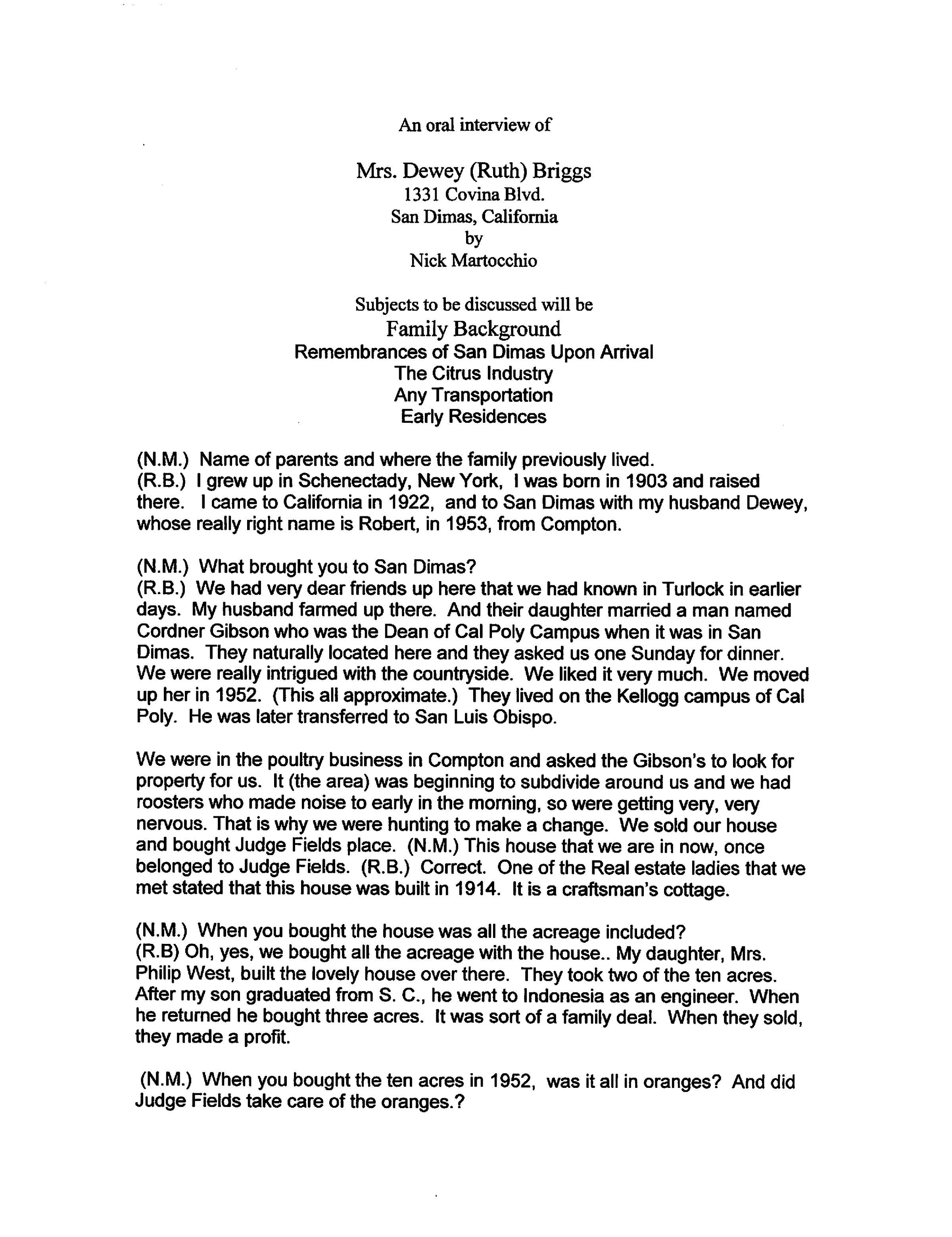 An oral interview of Mrs. Dewey (Ruth) Briggs, no date (See ScanSnap File 2019_05_16_13_43_07)