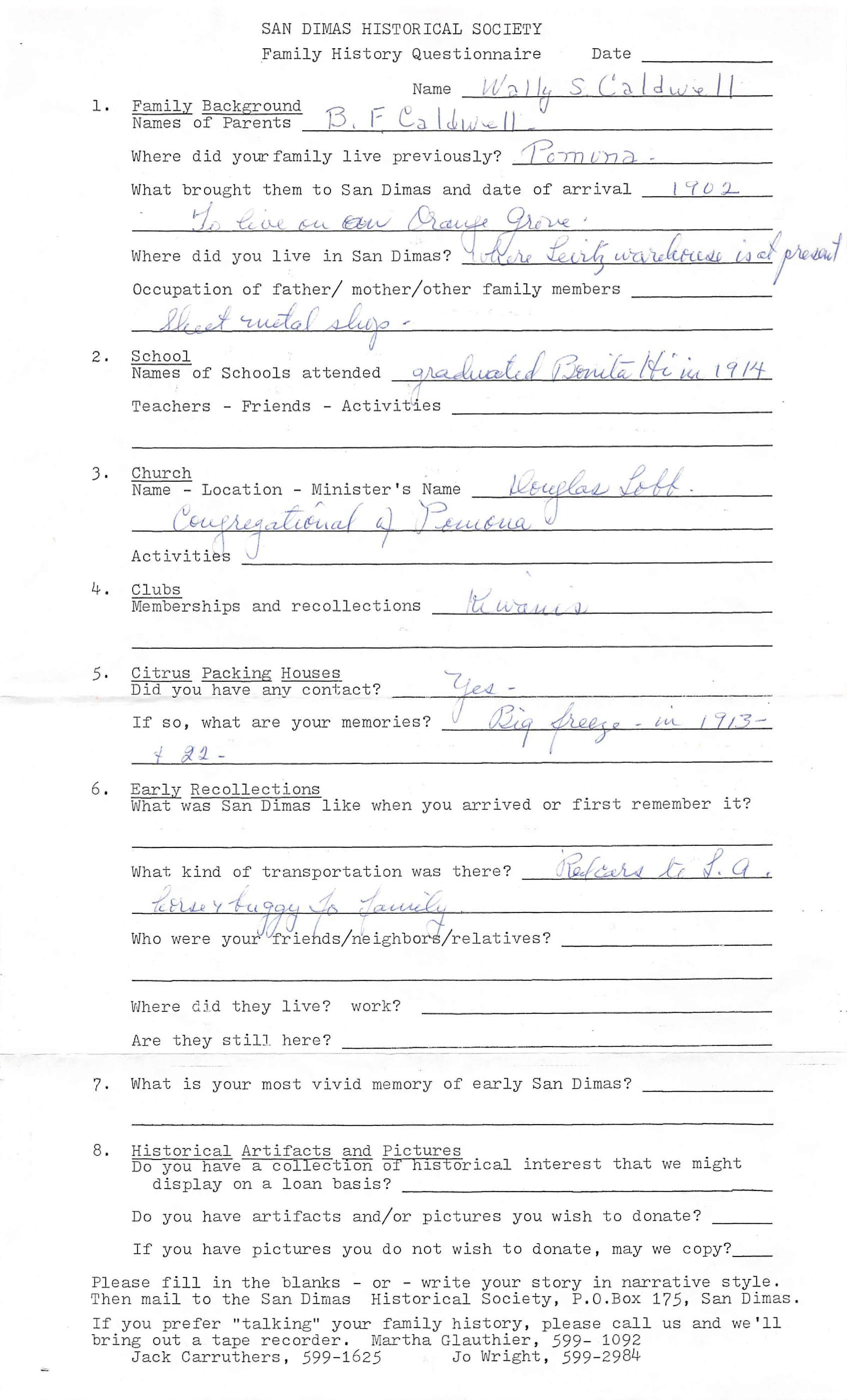 San Dimas Historical Society - Family History Questionnaire, Wally S. Caldwell, no date (See ScanSnap file 2019_05_16_13_47_39)