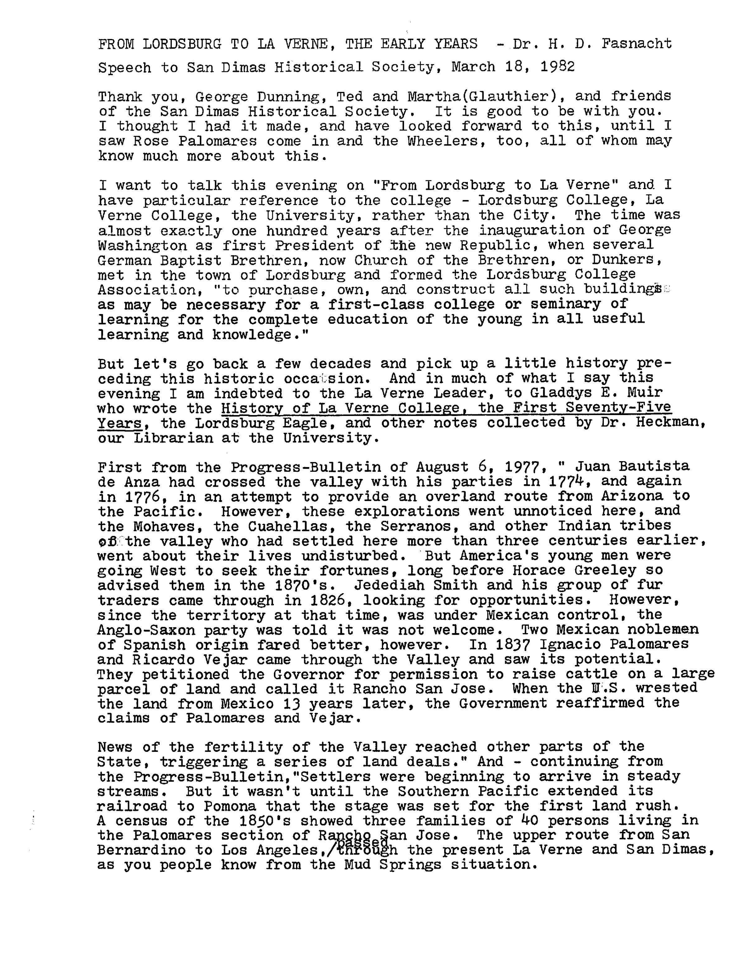 Dr. H. D. Fasnacht, Speech to San Dimas Historical Society, March 18, 1982 (See ScanSnap file 2019_05_30_14_59_14)