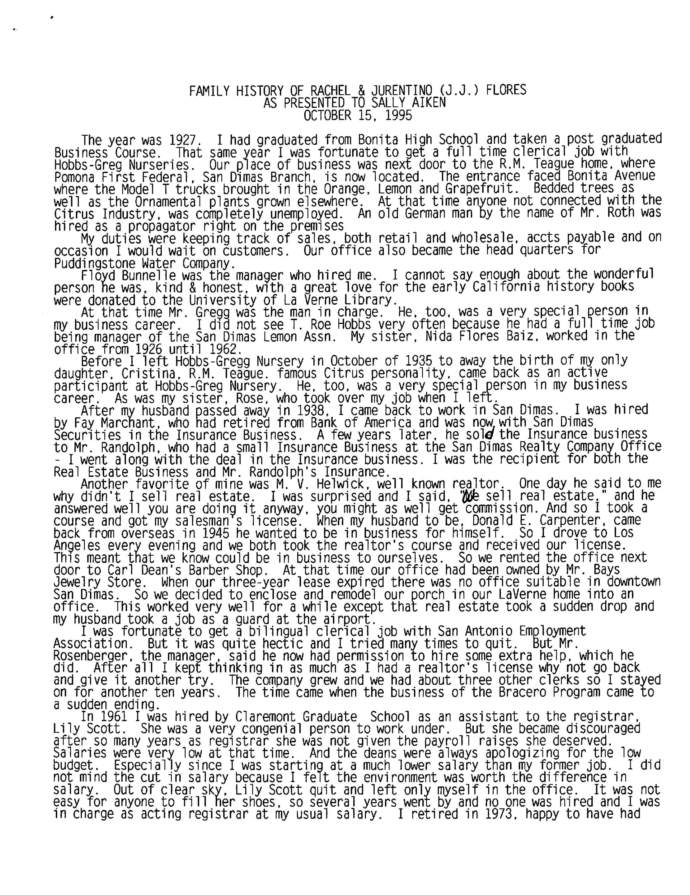 San Dimas Historical Society, Family History Questionnaire, Flores, October 15, 1995 (See ScanSnap file 2019_05_16_14_11_57)