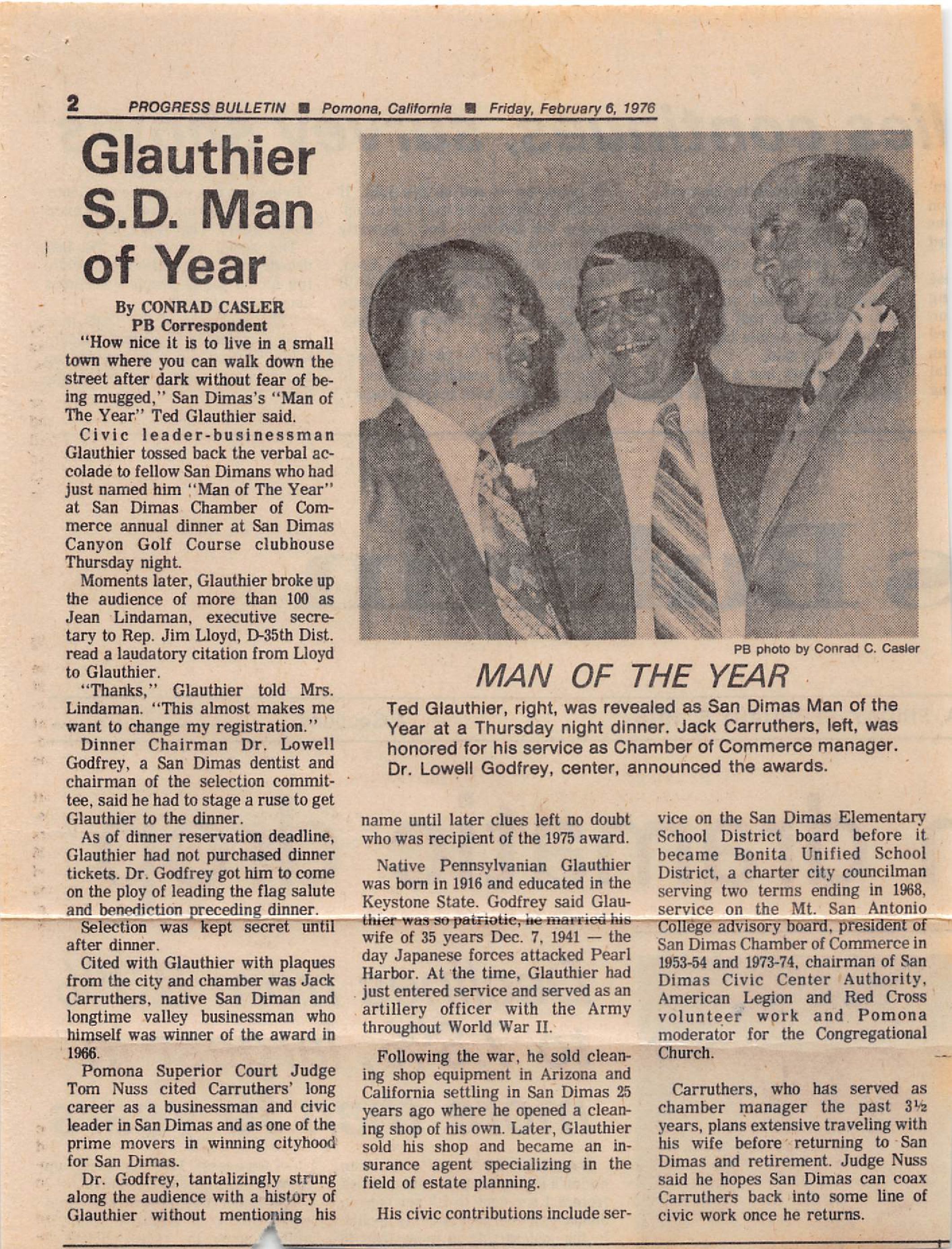 Article, "Glauthier S.D. Man of the Year," Progress Bulletin, February 6, 1976 (See ScanSnap file 2019_05_16_15_33_13)