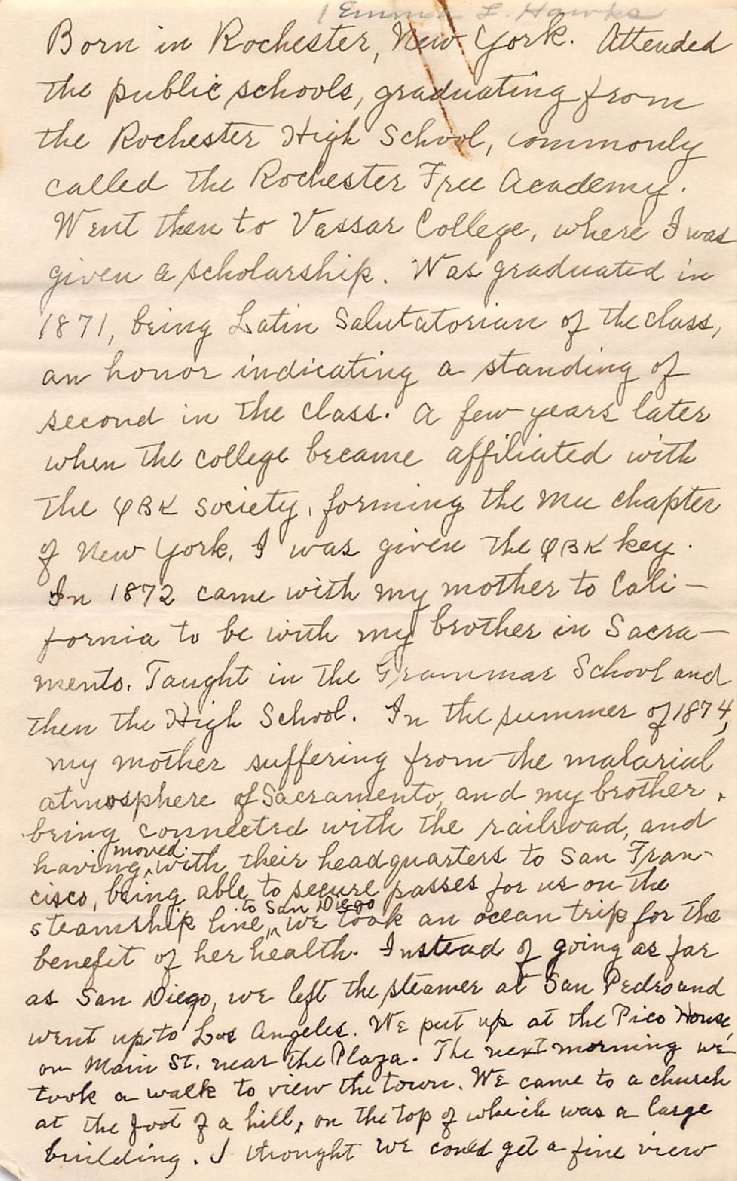 Handwritten biography of E. Hughes, written by Miss Emma L. Hawks shortly before her death for Mrs. Harry W. Walker. Emma Hawks died October 1936. (See ScanSnap file 2019_05_21_13_43_07)