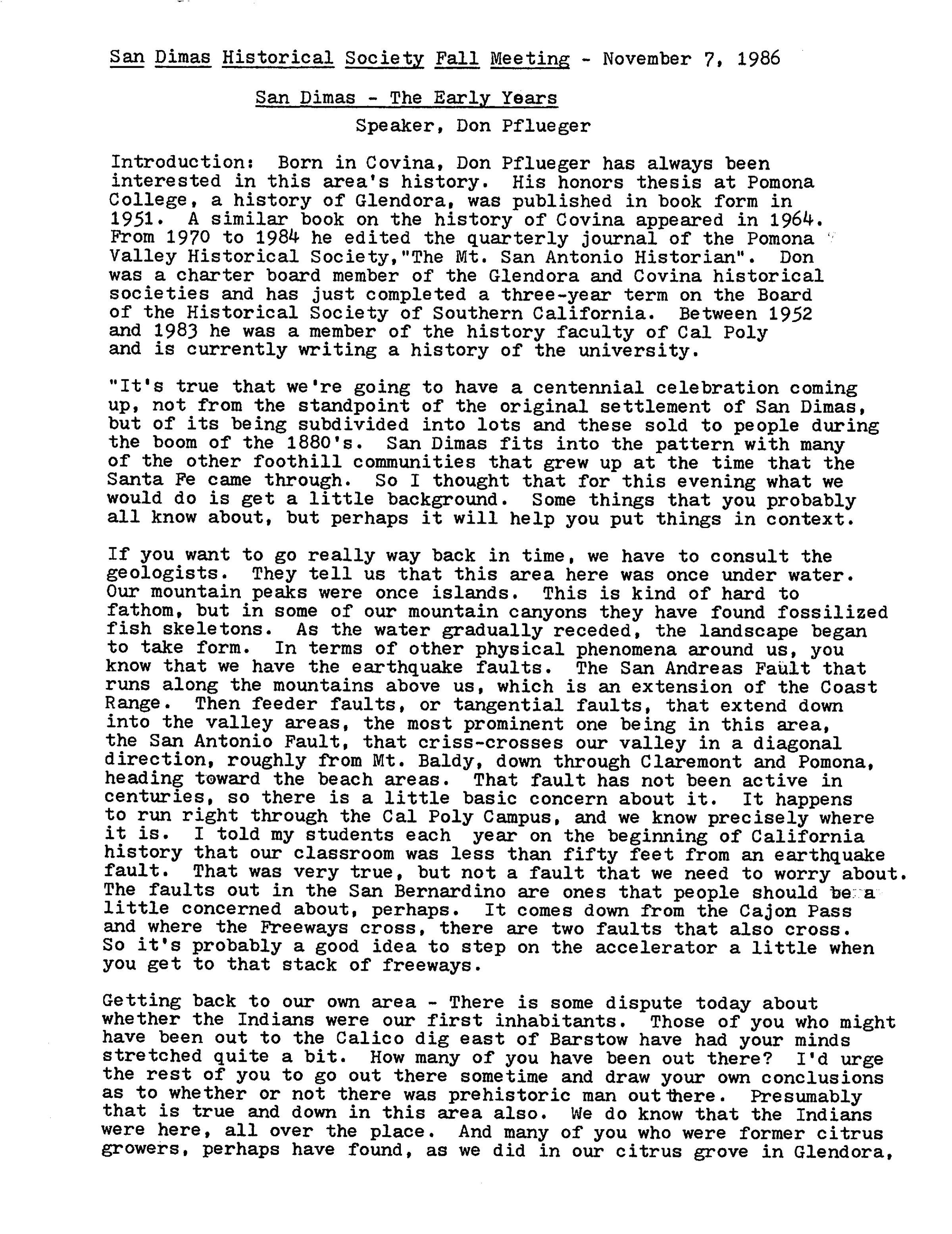 Don Pflueger Speech, San Dimas Historical Society Meetings, November 7, 1986 (See ScanSnap file 2019_05_30_14_04_22)
