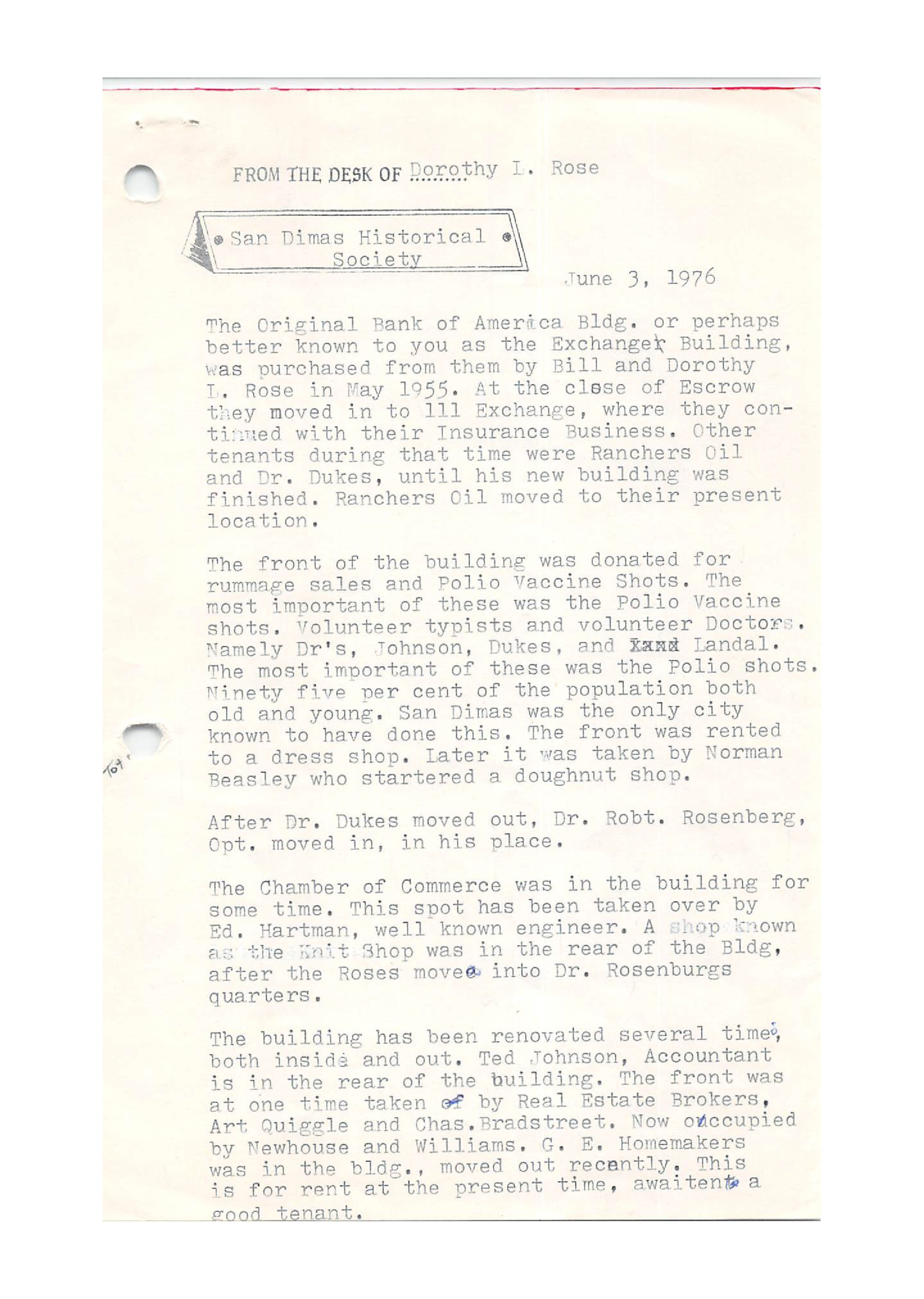 Notes from Dorothy L. Rose, June 3, 1976 (See ScanSnap file 2019_05_23_13_51_40)