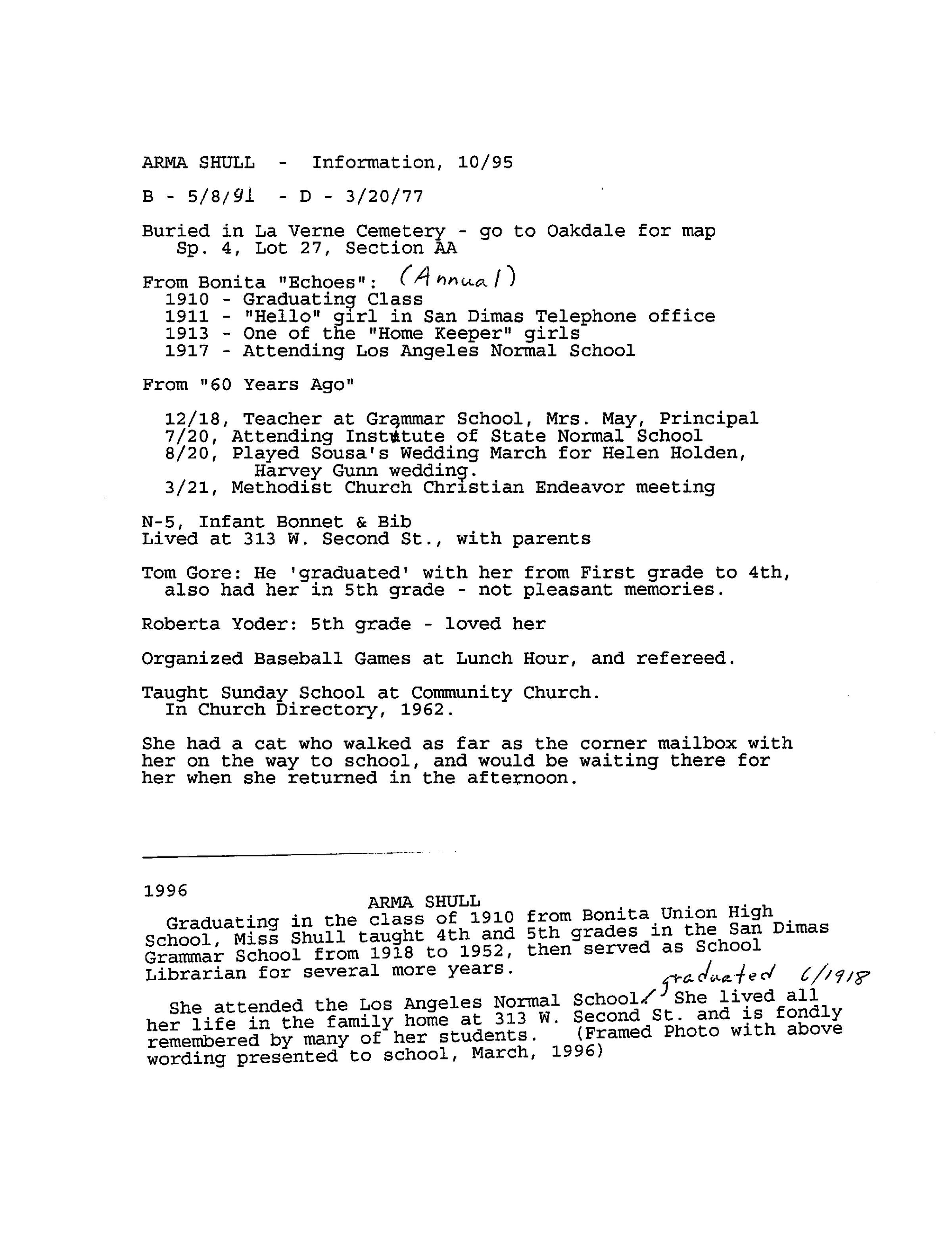 Biographical Notes of Arma Shull, October 1995 (See ScanSnap file 2019_05_23_14_14_05)