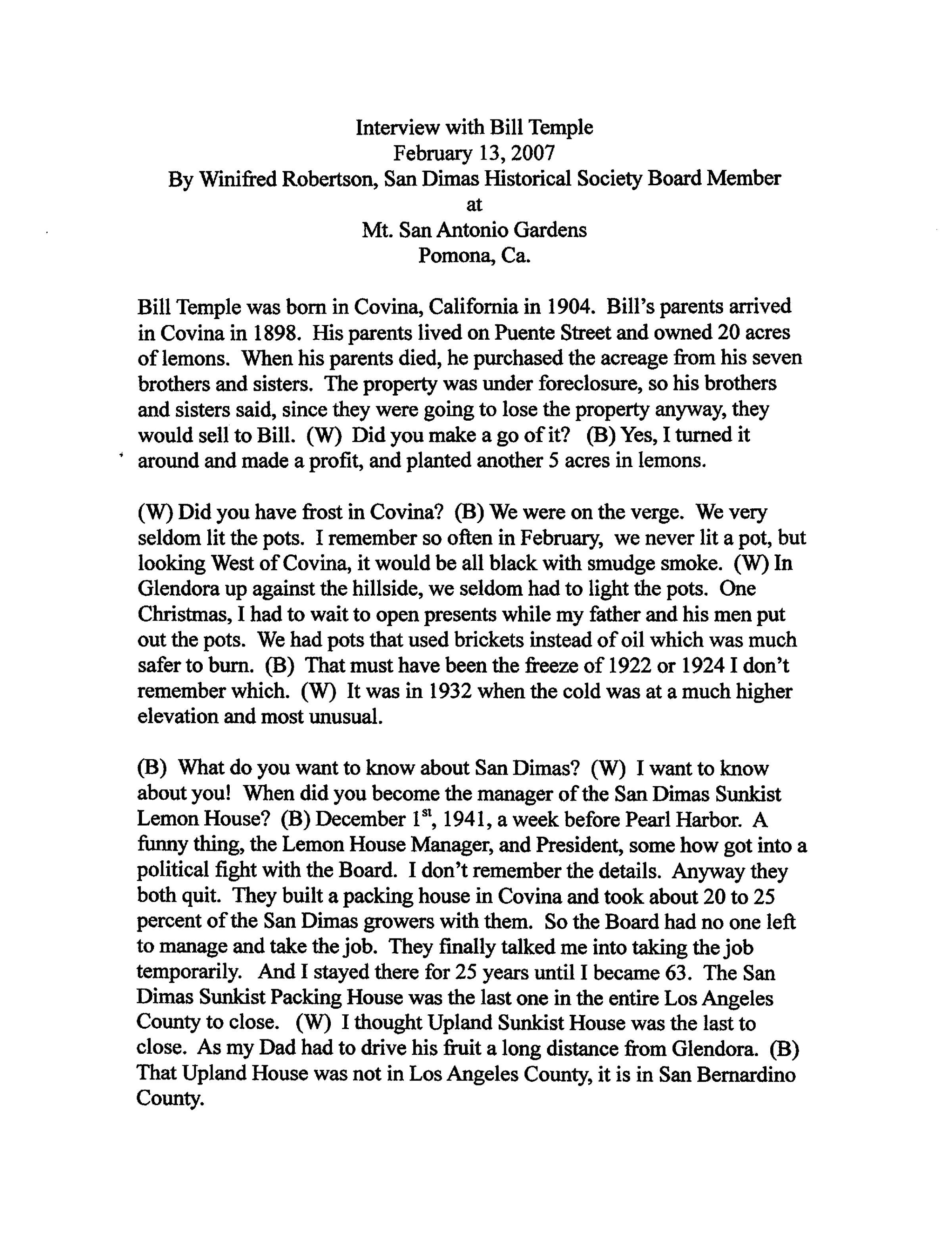 William B. Temple Speech, Meeting of San Dimas Historical Society, San Dimas Cayon Clubhouse, October 1, 1985 (See ScanSnap file 2019_05_30_13_49_28)