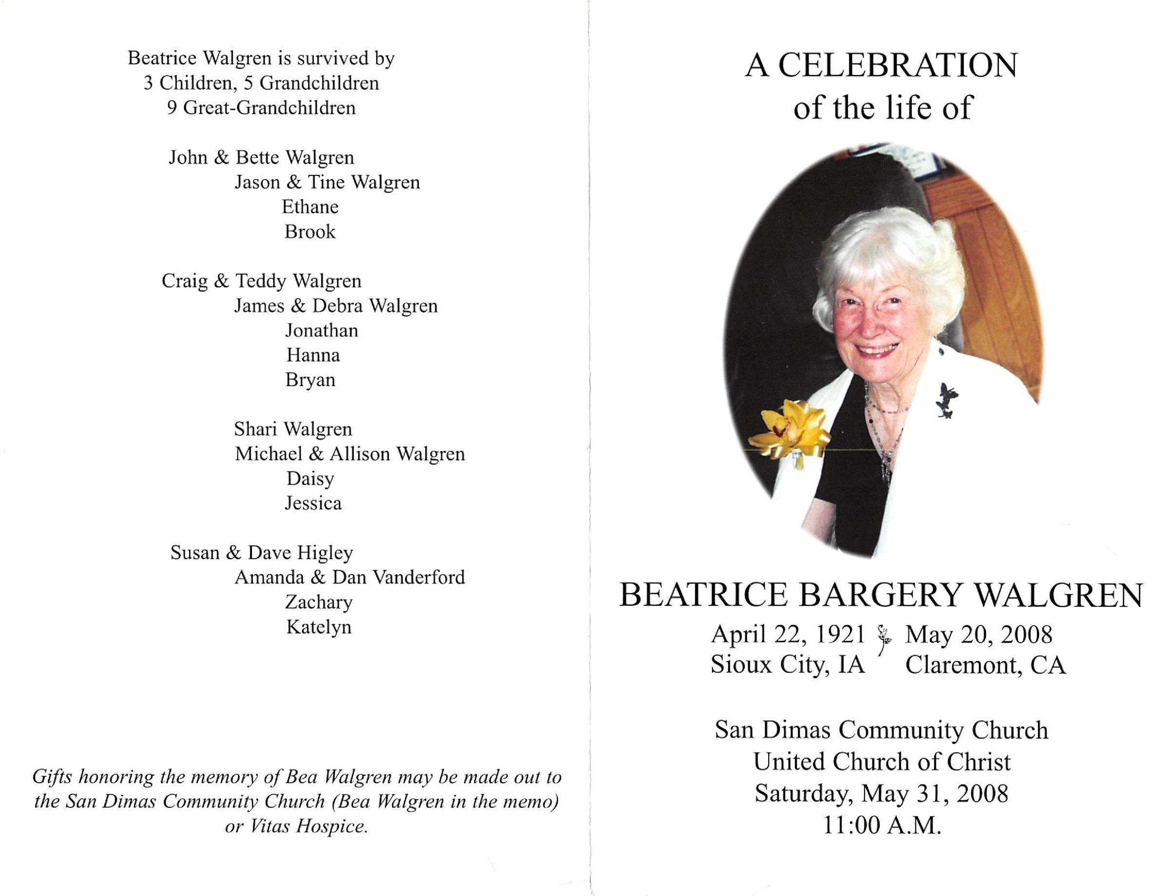 Program, Memorial for Beatrice Bargery Walgren, May 31, 2008 (See ScanSnap file 2019_05_23_14_51_23)