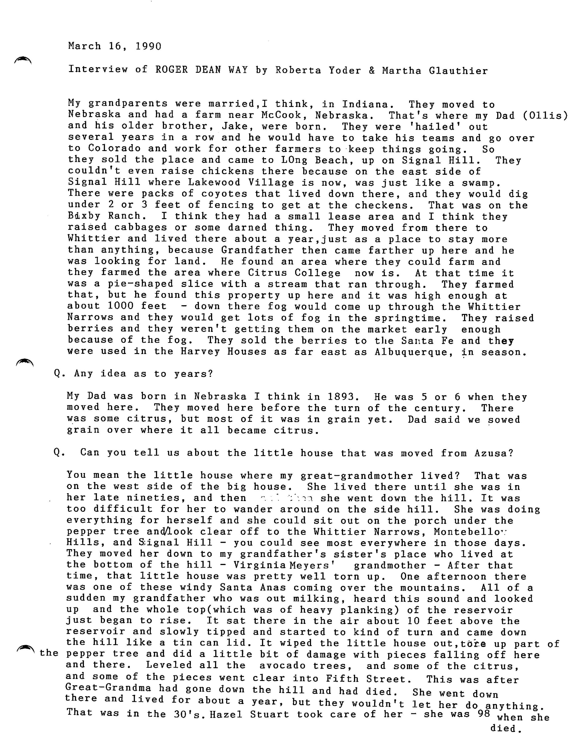 Interview of Roger Dean Way, March 16, 1990 (See ScanSnap file 2019_05_30_14_16_57) Interview of Grace Collins and Pearl Way, May 15, 1980 (See ScanSnap file 2019_05_30_14_55_30)