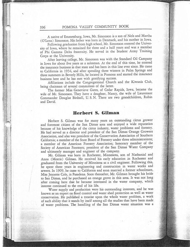 Photocopy of Pomona Valley Community Book with biographical sketch of Gilman, Herbert