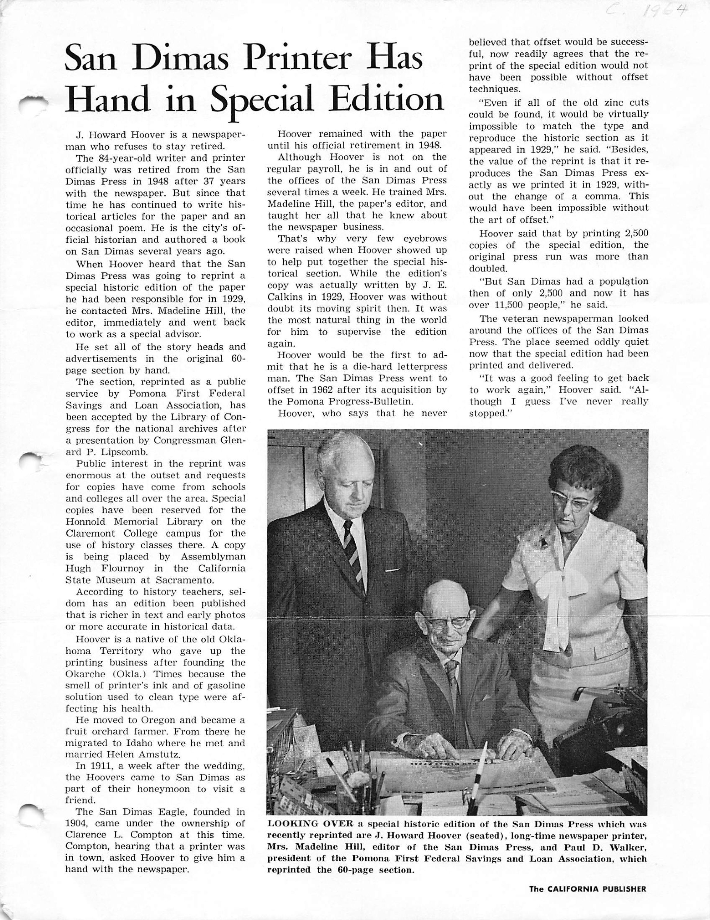 The California Publisher, "San Dimas Printer Has Hand in Special Edition", c. 1964 (see ScanSnap document 2019_05_09_15_06_56 on this computer)