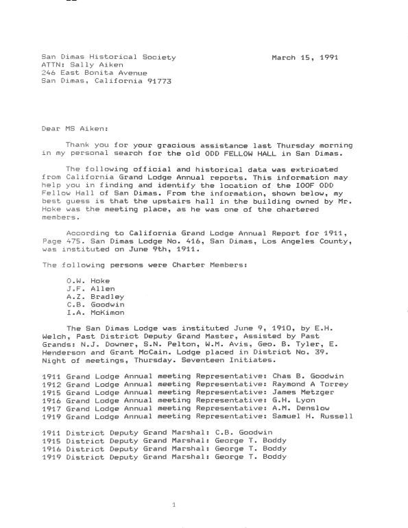 Letter - From: Paul Daniel Conley, of Ontario Lodge 345, To: Sally Aiken, regarding the old Odd Fellow Hall in San Dimas, dated March 15, 1991