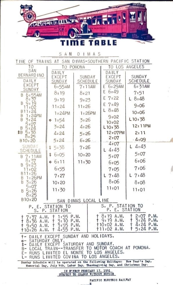 Time Table - Pacific Electric Railway, Time of Trains at San Dimas - Southern Pacific Station, in effect, February 17, 1941