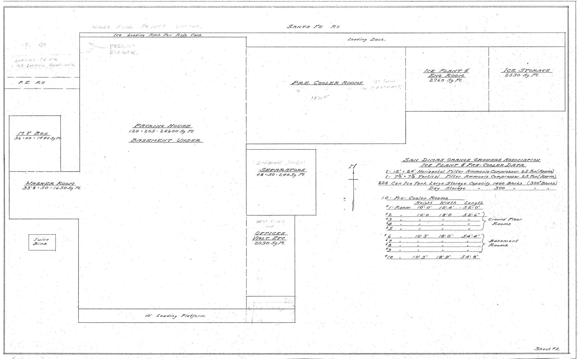 2 Sheets 1. Room Plan (Diagram) for San Dimas Orange Growers Association Ice Plant & Pre-Cooler 2. Site Plan for Orange Packing House no date (2 copies)