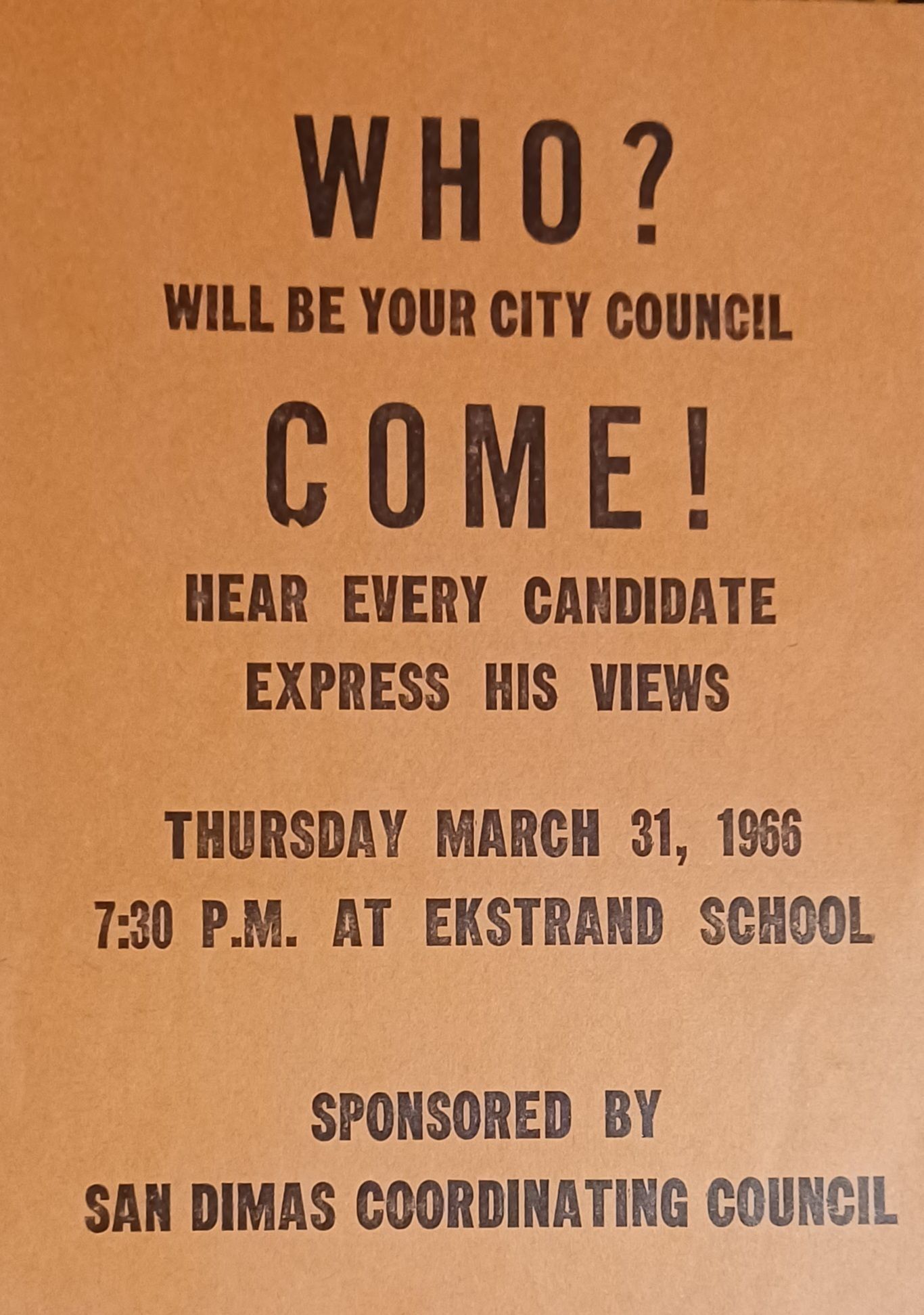 Flyer - San Dimas Coordinating Council "Who? Will Be Your City Council Come!" March 31, 1966