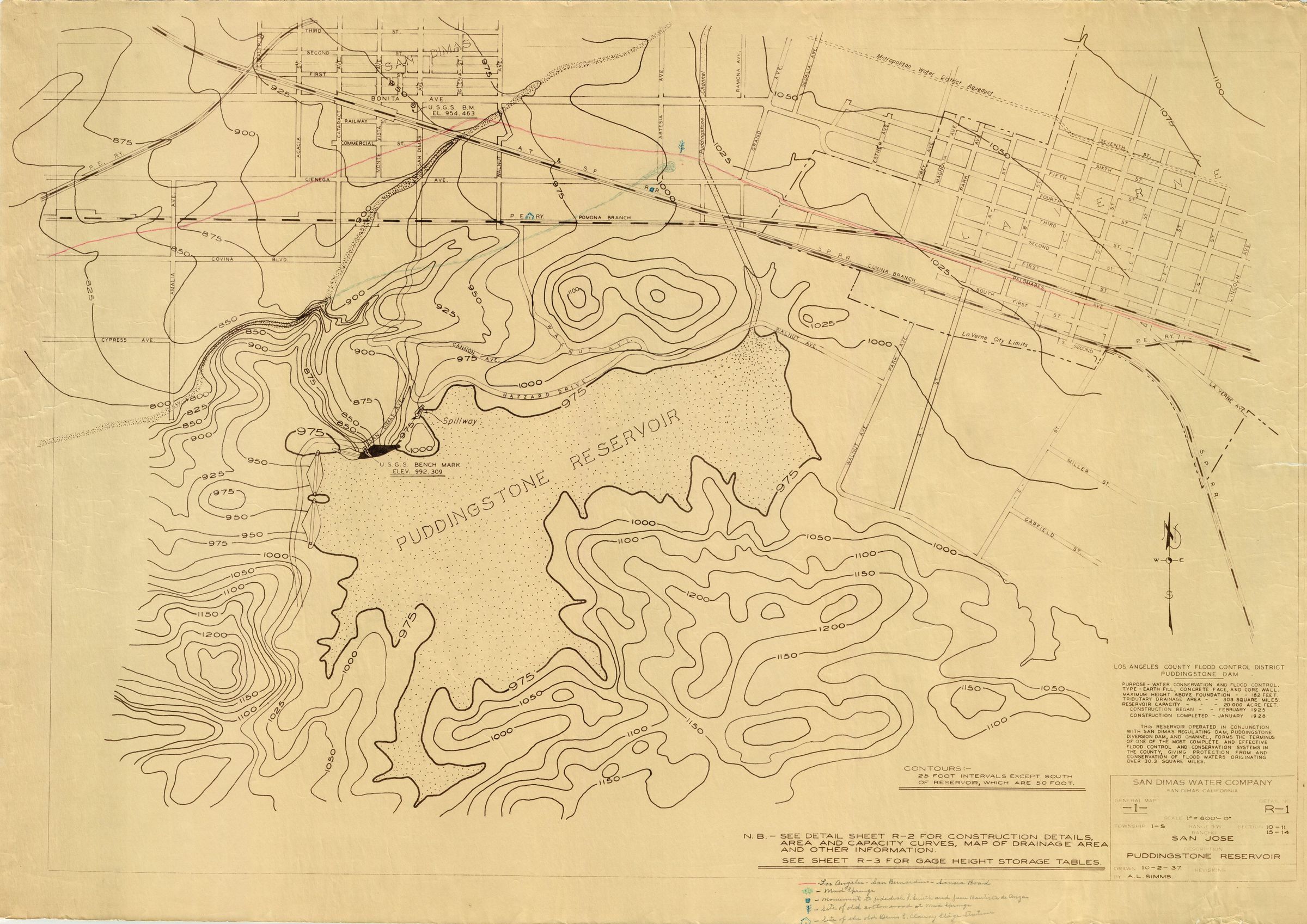 Detail Sheet showing Contours for Puddingstone Reservoir Shows Mud Springs, old roads, L.A.Flood Control project. Special legend added by Mrs. Walker. Dated 1937.