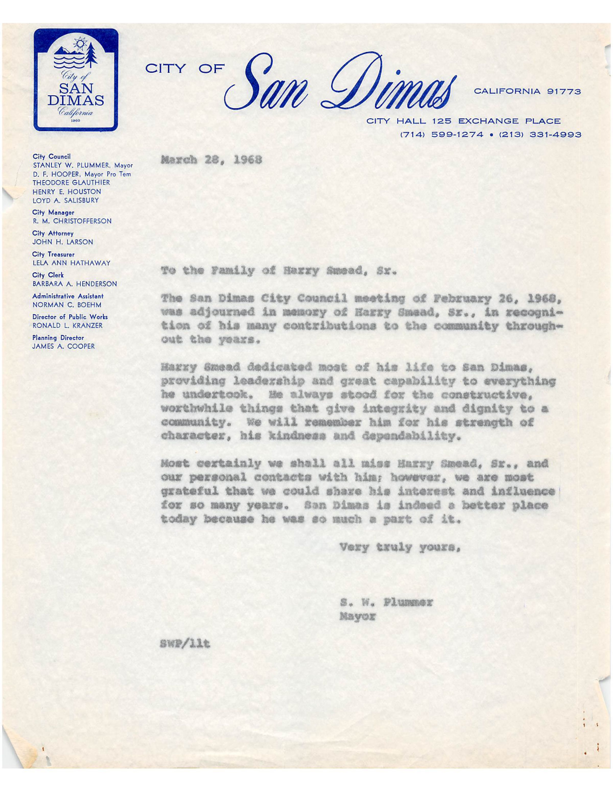 Letter from Mayor S. W. Plummer to family of Harry Smead, Sr., March 28, 1968 (see SnapScan document 2019_05_09_15_23_44)