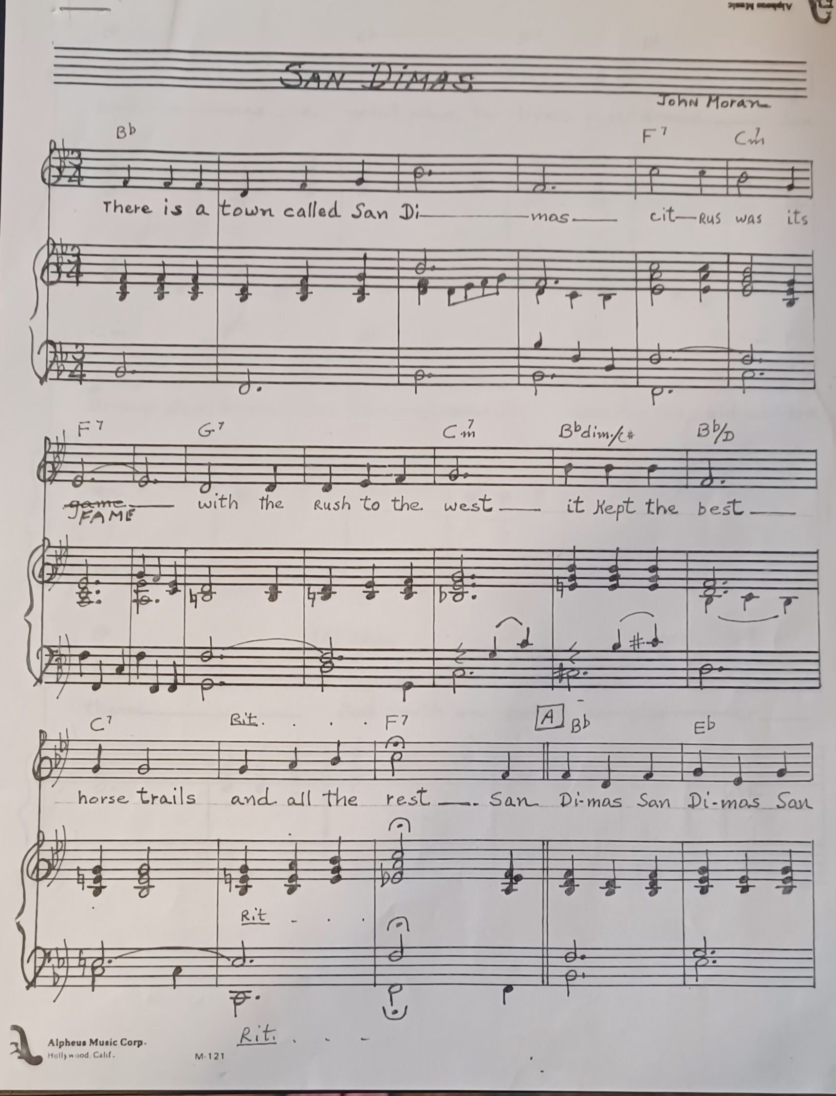 Sheet Music and lyrics for song "San Dimas" written by John Moran