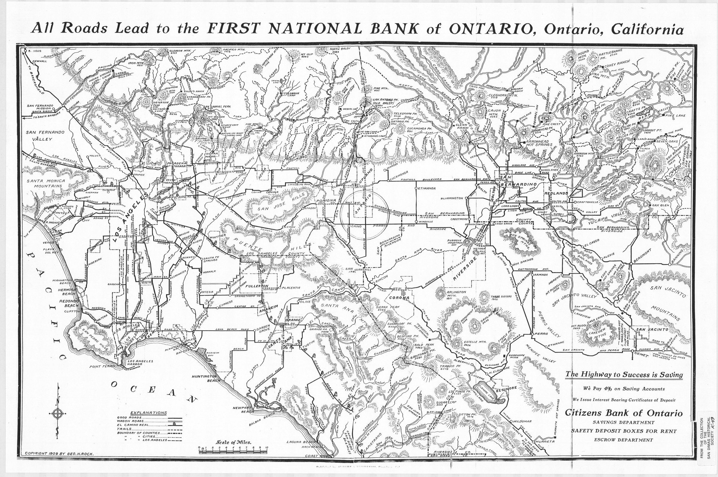 Copy of 1909 Map, Los Angeles, Orange, Riverside & San Bernardino Counties - was promotion for Citizens Bank of Ontario "The Highway to Success is Saving"