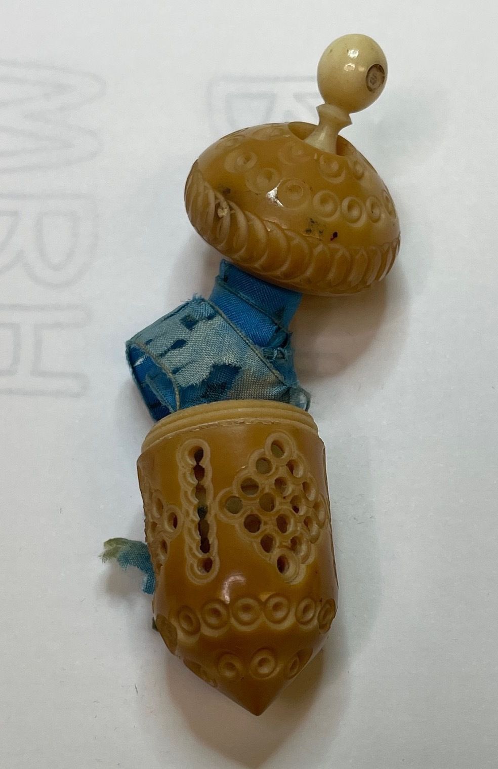 4. Bone and Tagua nut retractable tape measure. End of teal tape is missing, now starts at number three. Possibly a top finial is missing as there is a bone spiral pole extending form the center of the ball-shaped tape measure. The nut is carved with a wreath of leaves along the bottom of the ball-shape and coils surrounding the shape to the top where a flower-like collar sits. There is a slender slot on the side for the tape to be pulled out.