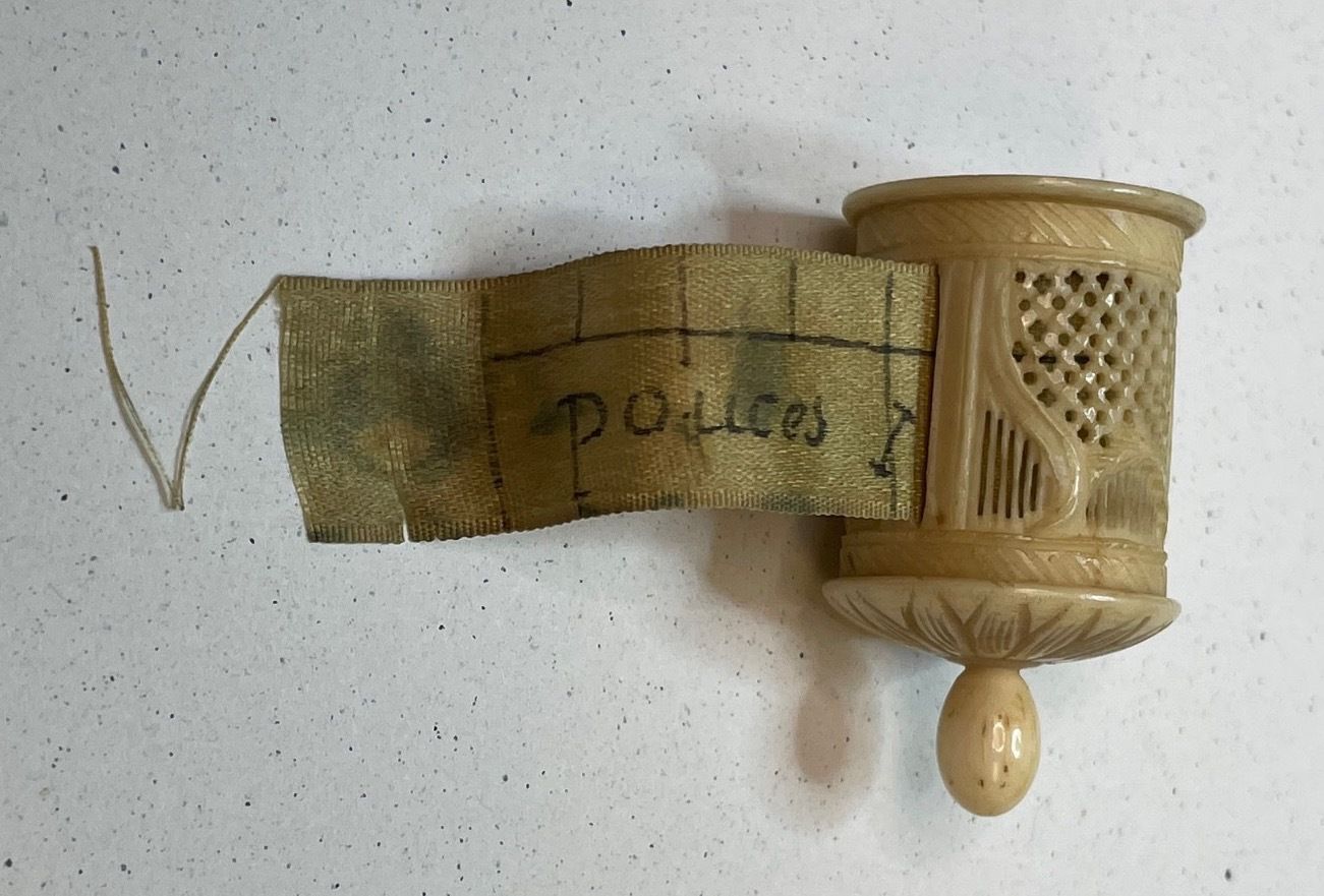 5. Bone retractable tape measure printed in French POUCES for inches. Carved cylinder with an ecru tape