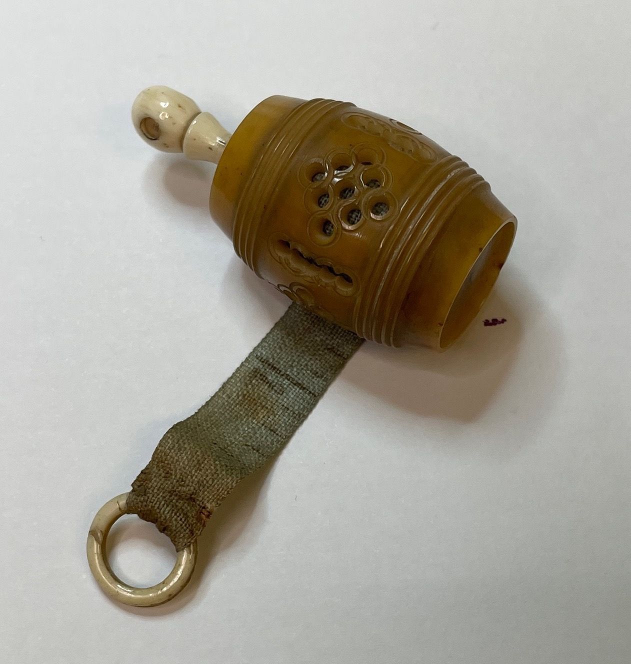 3. A barrel-shaped tagua nut holder for a green silk measuring tape. A bone ring pull is attached to the end of the measuring tape and the spindle with a Stanhope is also bone