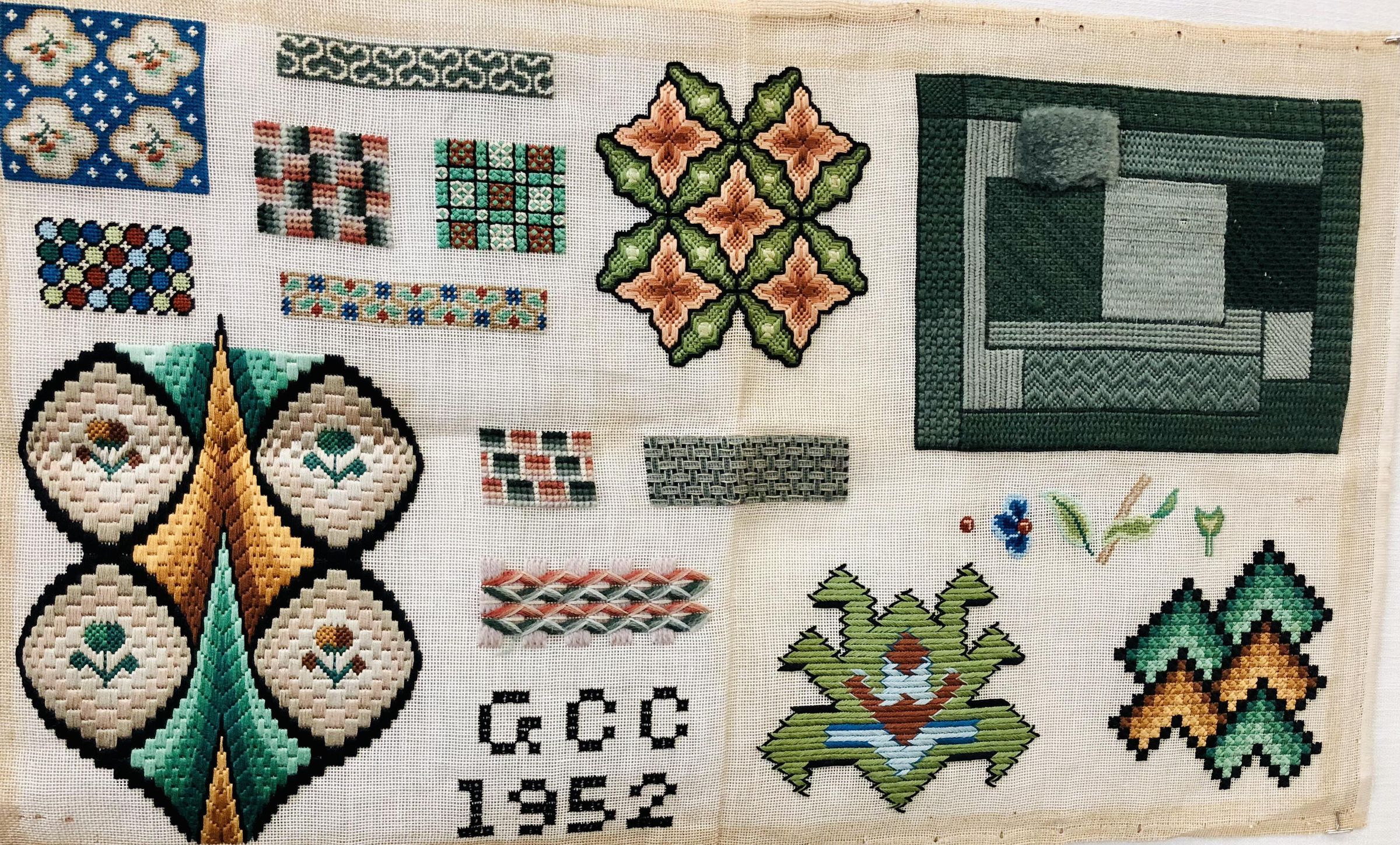A sampler of counted canvas stitches on in wool on a canvas ground.Collection